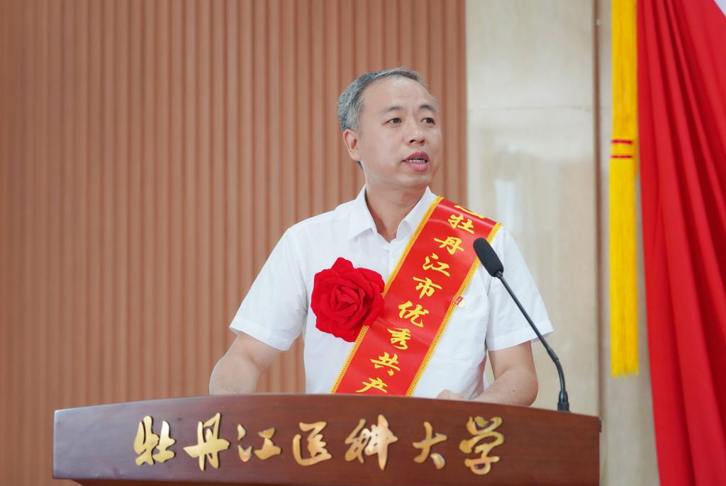 会议在庄严的国歌声中拉开了序幕,学校党委常委、副校长刘星宣读了牡丹江市委、牡丹江医科大学党委表彰“两优一先”人员名单。刘星强调,全校各级党组织和共产党员,要以表彰的先进典型为榜样,坚定理想信念,对党绝对忠诚,严以律己,牢记宗旨,砥砺奋进,始终以实际行动践行党旗在基层高高飘扬。