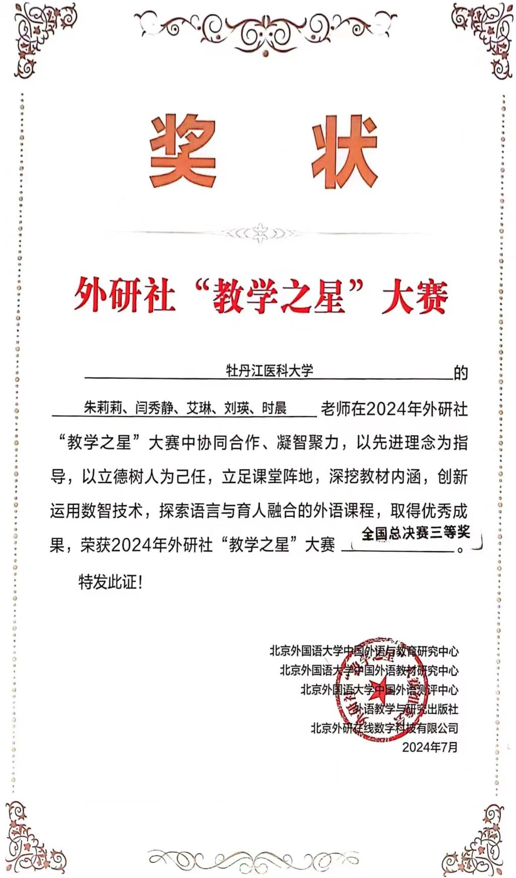 “教学之星”大赛自创办以来,得到了全国高校外语教育领域的广泛认可,被列入中国高等教育学会《高校竞赛评估与管理体系研究》“全国普通高校教师教学竞赛分析报告”数据来源,受到各省教育厅的高度重视,被列为国家级赛事。2024年全国高校外语“教学之星”大赛主题为“外语教材的有效使用:数智融合,创新育人”。我校外语教研部朱莉莉、闫秀静、艾琳、刘瑛、时晨团队从2024年5月份开始就利用业余时间积极备赛。历经初赛、复赛的层层选拔,在全国大学英语321个参赛队伍中荣获复赛特等奖,并最终于7月16日在山西太原荣获全国三等奖的佳绩。本次大赛有大连理工大学、 对外经济贸易大学、 国防科技大学等高校外语届精英参加,可谓群星云集、高手如林。