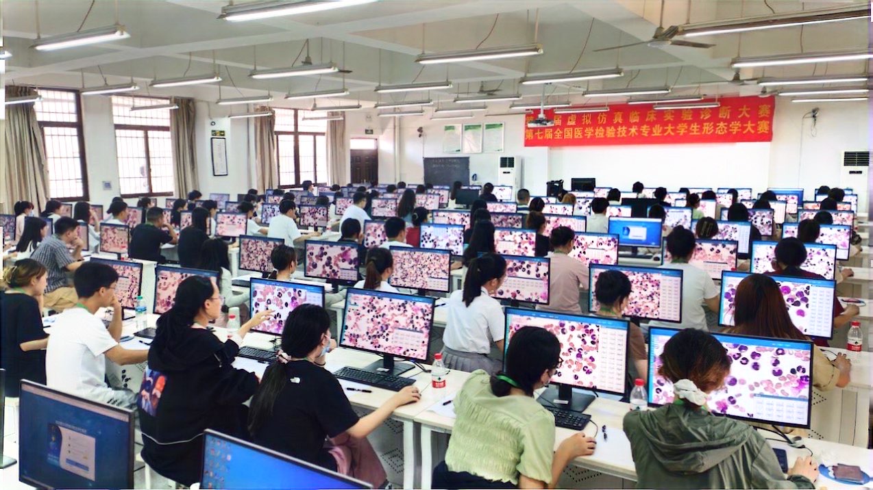 检验技能大赛不仅是一场竞赛,更是一个交流平台,它为检验行业的同仁们提供了一个相互学习、共同进步的机会。虚拟仿真教学突破实体教学的局限,有助于学生对知识的理解和掌握,也促进同学们对形象思维和直觉思维的发展。医学检验技术专业大学生形态学大赛包含临床检验形态涂片在线考核和骨髓涂片血细胞分类计数两部分。临床检验形态涂片在线考核涵盖血液、微生物、寄生虫和体液等形态涂片,涉及600多个知识点;骨髓涂片血细胞分类计数模拟显微镜观察骨髓涂片,进行血细胞的辨认并分类计数,考查学生的临床应用能力。随着大赛的圆满落幕,所有参与者都满载而归,不仅收获了荣誉与奖励,更重要的是,同学们在这里找到了提升自我的新动力。