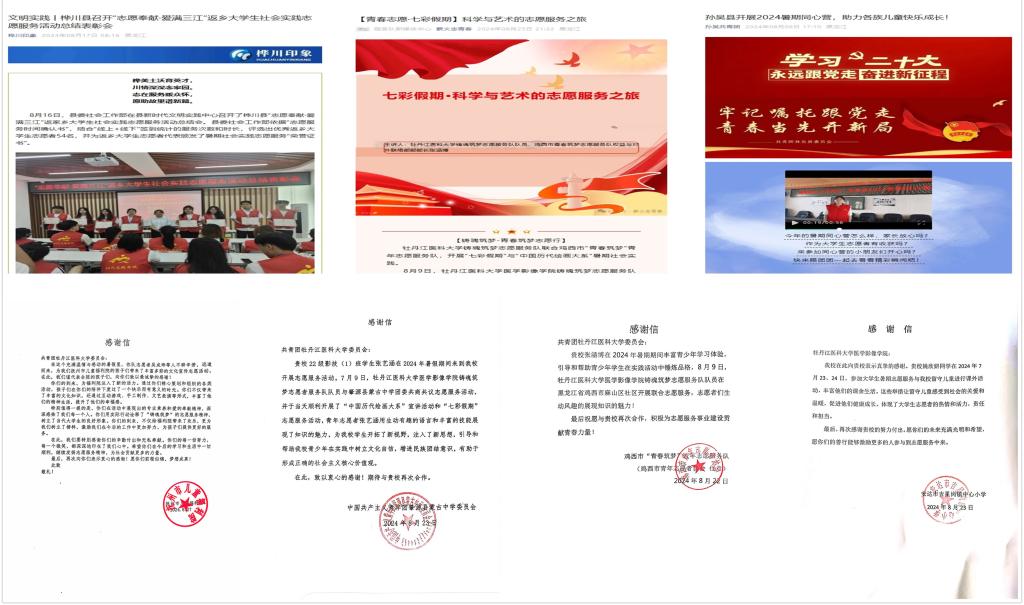 暑假期间铸魂筑梦志愿服务队组织全体队员积极深入高校和家乡所在地的社区、学校、青年之家、童心港湾等场所面向留守儿童、寄宿儿童、困境儿童等少年儿童群体重点围绕思想引领、文明生活、身心成长、科技创新、快乐学习、艺术素养、文化传承等内容开展丰富多彩的假期志愿服务。截至目前,团队共37名青年志愿者,前往20个市县乡村开展“七彩假期”活动41次,志愿服务时长累计216小时,服务青少年共计792人次。志愿服务先后被牡丹江市广播电视台、鸡西市青年志愿者协会、中共桦川县委宣传部、孙武共青团等多家媒体宣传报道,收到来自抚州市儿童福利院、鸡西市青年志愿者协会、中国共产主义青年团肇源县蒙古中学委员会、安达市吉星岗镇中心小学等多封感谢信,对我校志愿者的辛勤付出和卓越表现给予高度肯定和赞扬。