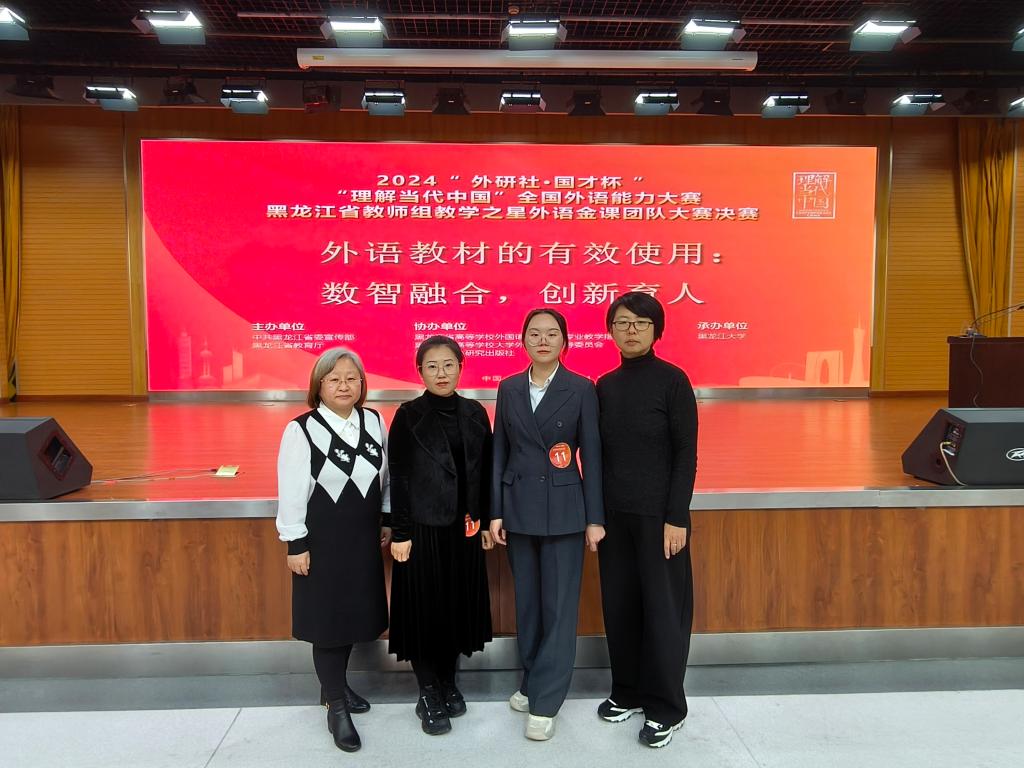 2024黑龙江省外语金课团队大赛决赛于2024年11月1日在哈尔滨落下帷幕。我校外语教研部朱莉莉、艾琳、刘瑛、闫秀静、丁坤敏团队荣获一等奖。