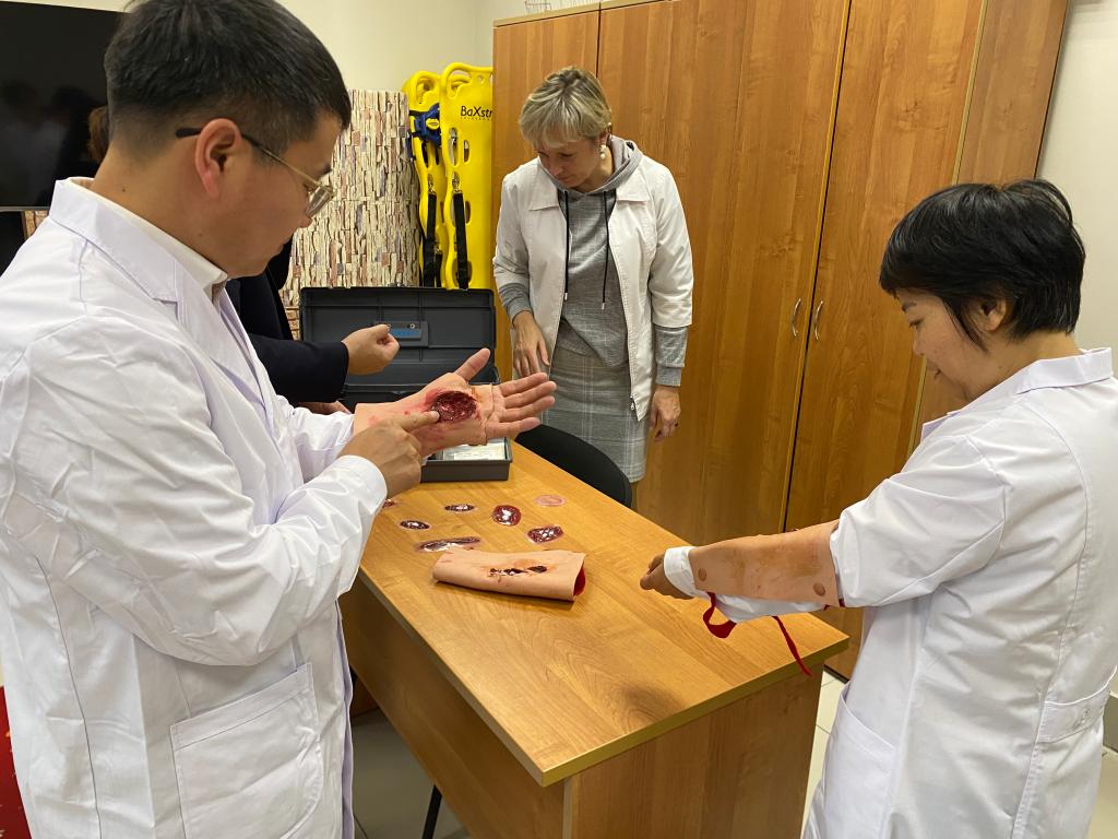 俄方师生陪同我校代表团参观校模拟中心、牙科诊室和机器人药房。俄方专家为我校代表团进行了外科手术、静脉输液、外伤应急处置、体外心肺复苏、全流程牙科疾病诊治及3D打印技术用于牙体制作、腹腔镜和心功诊断等方面的操作模拟演示。
