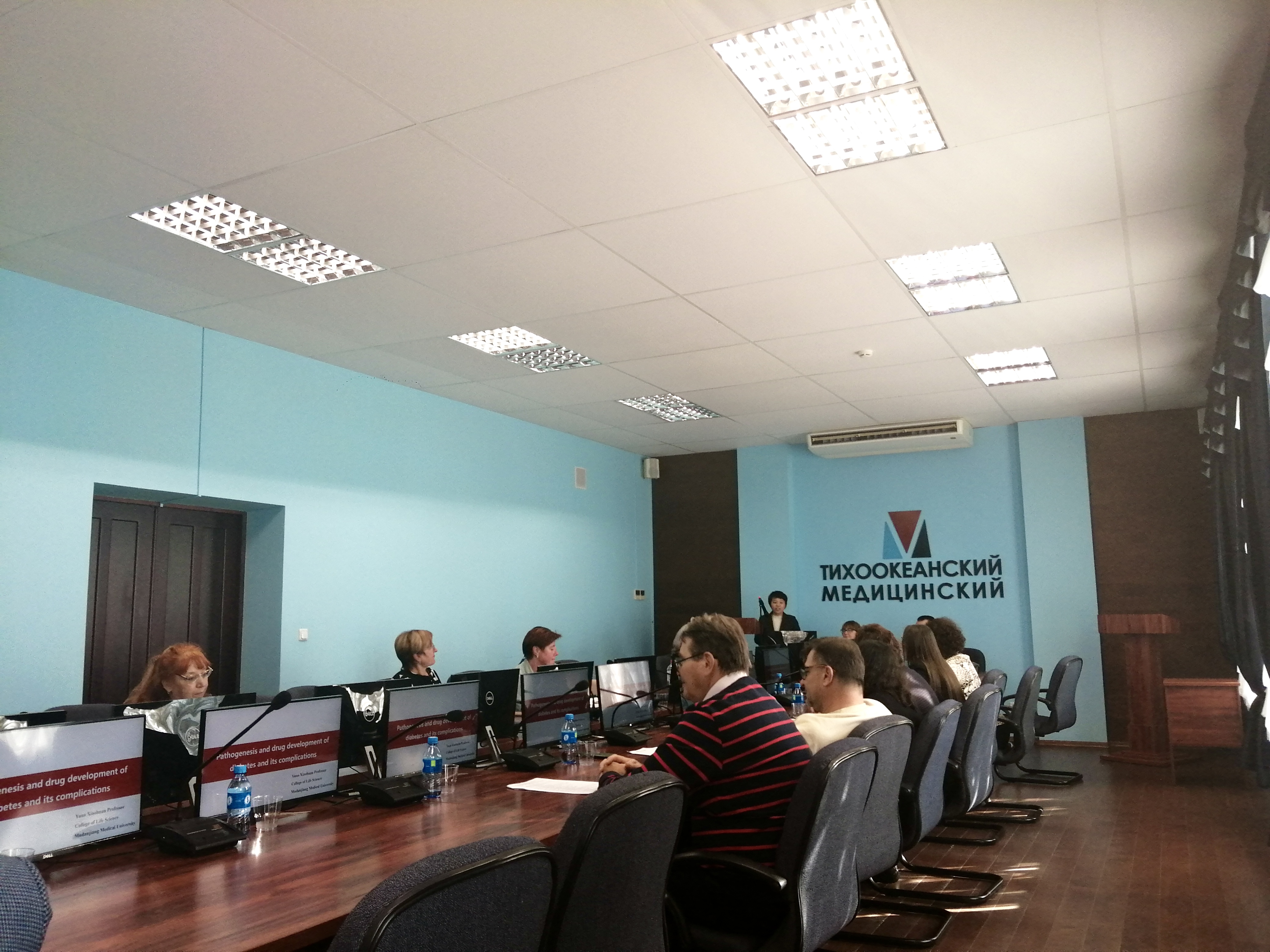 11月14日,俄方与中方参会高校牡丹江医科大学、哈尔滨医科大学代表举行座谈,我校与俄方院校就两校科研合作及师生短期交流方面进行深入讨论。俄方副校长表示,太平洋国立医科大学十分注重国际交流与合作,期待两校不断深化合作伙伴关系。我校代表袁晓环向太平洋国立医科大学赠送礼物。