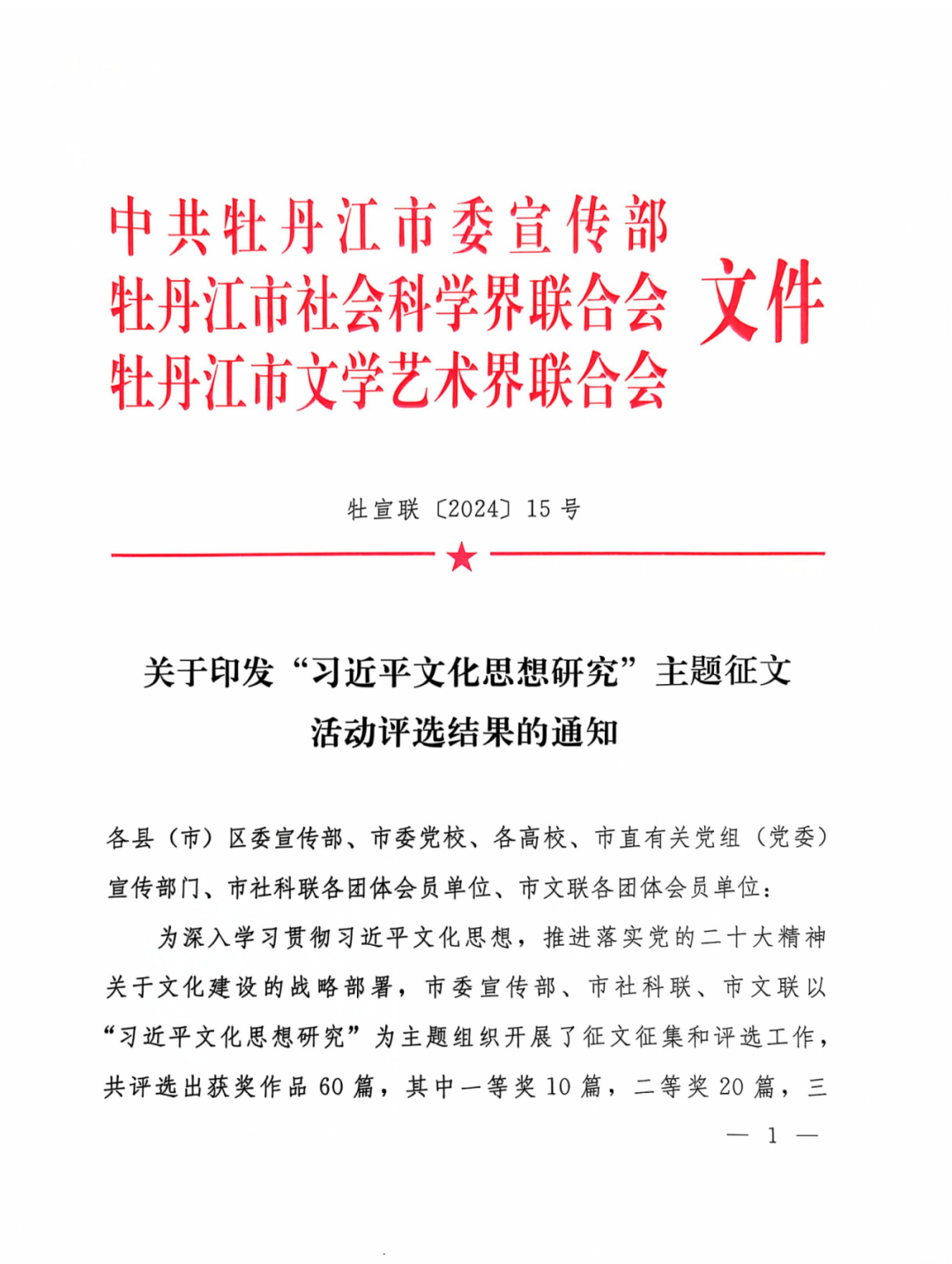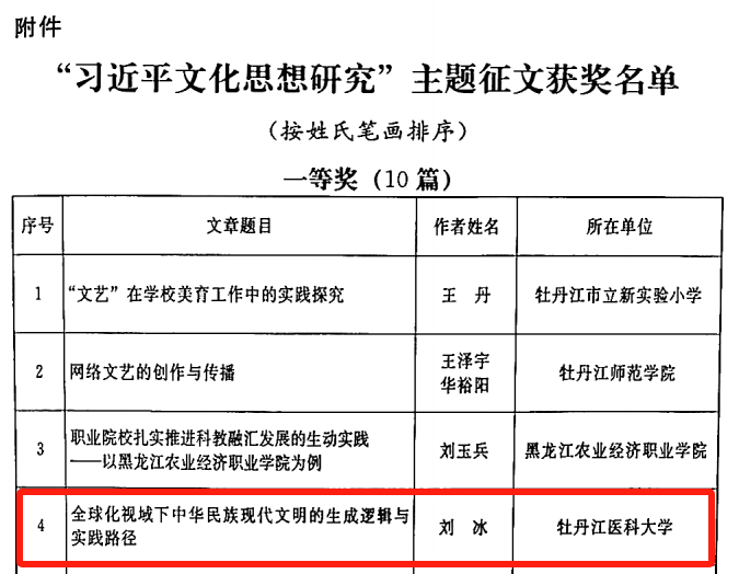 为深入学习贯彻习近平文化思想,推进落实党的二十大精神关于文化建设的战略部署,市委宣传部、市社科联、市文联以“习近平文化思想研究”为主题组织开展征文征集和评选工作。学校选送的马克思主义学院教师刘冰的《全球化视域下中华民族现代文明的生成逻辑与实践路径》一文,经初评、复评等程序,荣获征文一等奖。