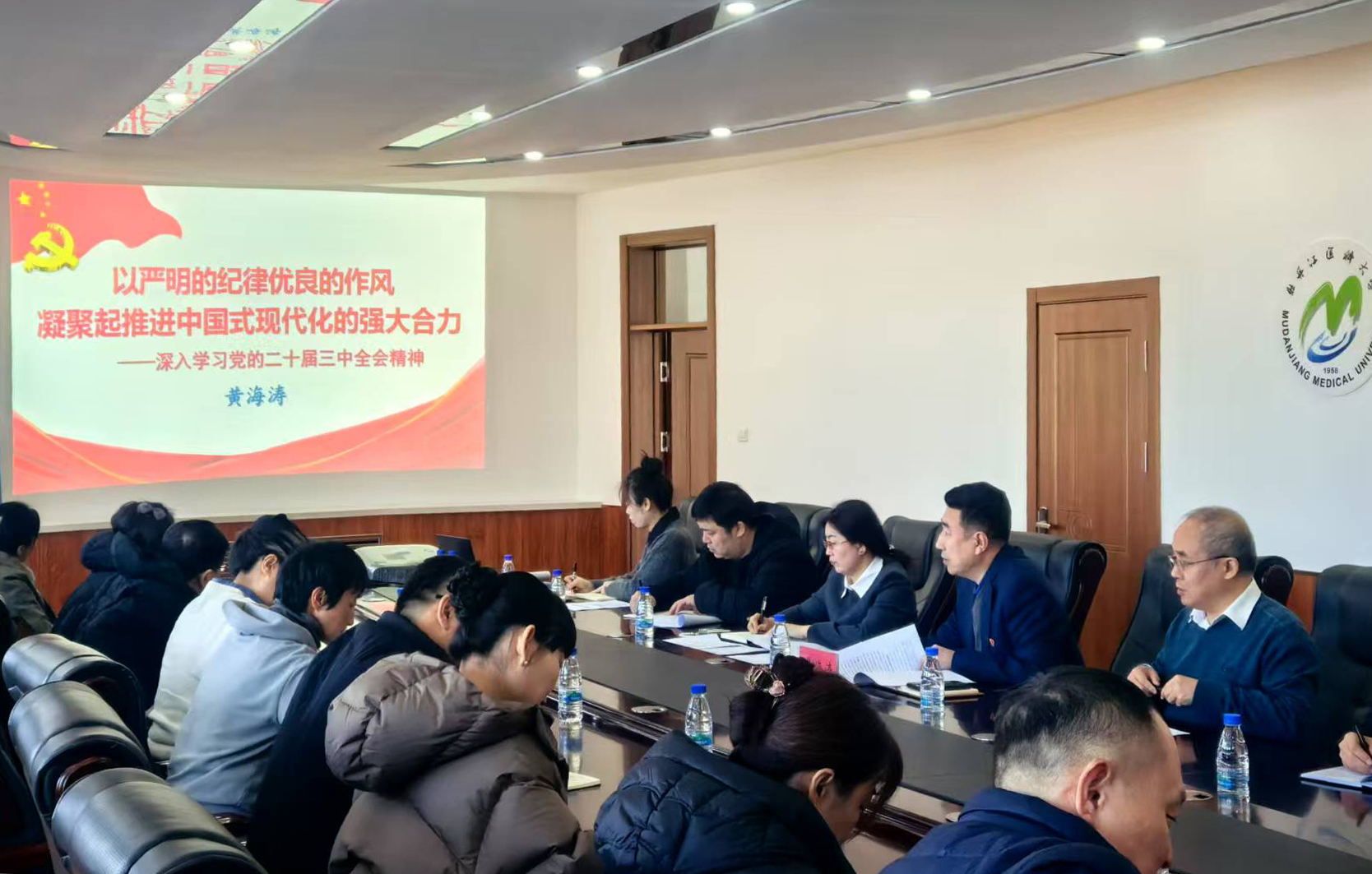 黄海涛强调,学习宣传贯彻党的二十届三中全会精神是我们当前和今后一个时期的重大政治任务,学校全体纪检监察干部要找准职责定位,纵深推进全面从严治党、党风廉政建设和反腐败斗争,把从严管理监督和鼓励担当作为高度统一起来,充分发挥党的纪律教育约束、保障激励作用,推动全校党员干部,凝聚牡医力量,聚焦立德树人根本任务,以更加饱满的工作热情和更加奋发有为的工作态度,把三中全会精神落实到实际工作中,全力推动我校高水平特色应用型医科大学建设,为推进龙江中国式现代化作出牡医贡献!
