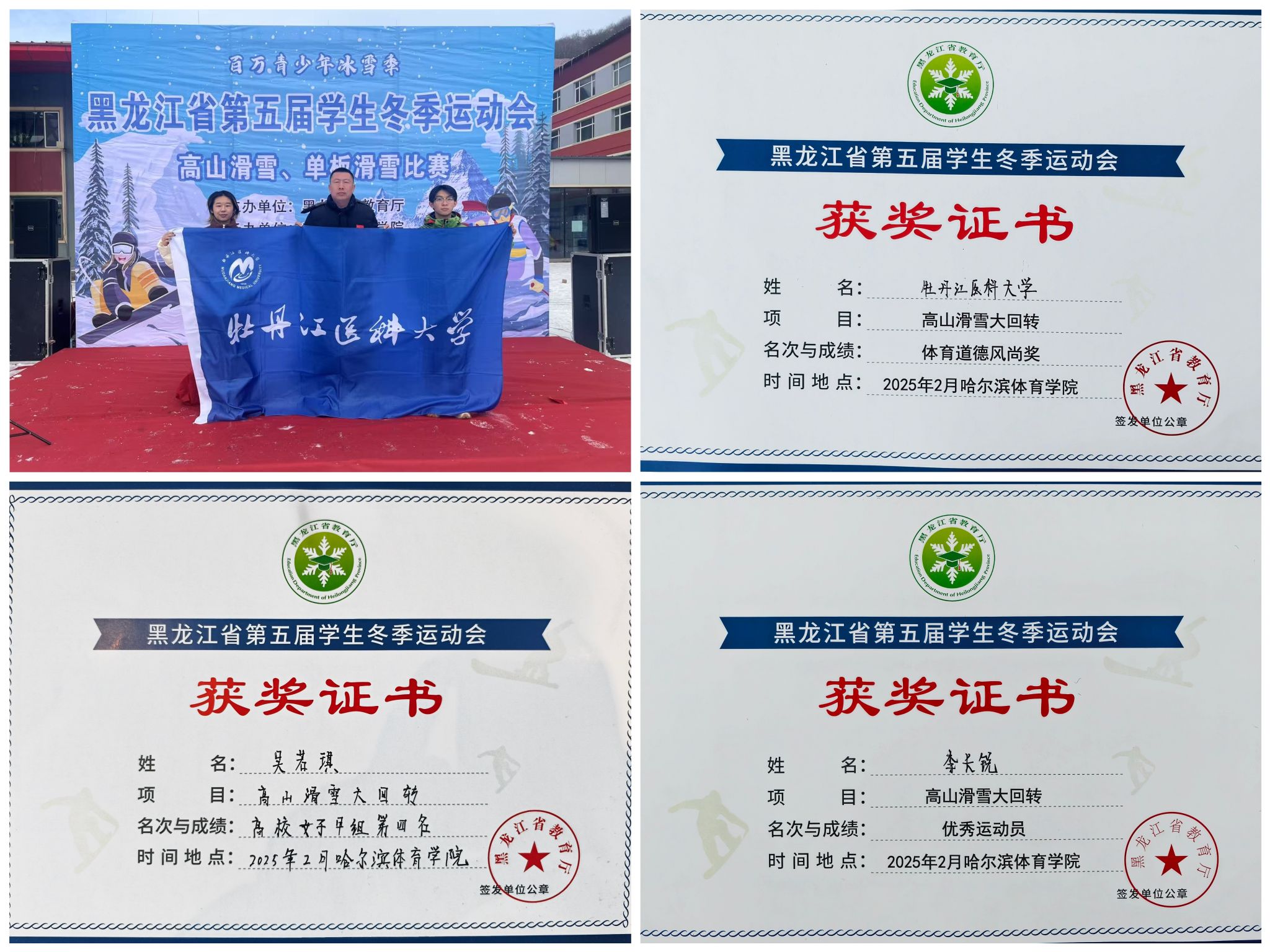 本次赛事,我校选派体育教研部副主任黄春艳担任领队,由王建治老师担任教练,选拔吴若琪(2022级临床1班)、李长锐(2022级影像13班)两名学生运动员组建了牡丹江医科大学高山滑雪代表队。吴若琪同学在比赛中获得高校女子(甲组)高山滑雪大回转第四名的好成绩,这项成绩刷新了我校参加省级雪上项目比赛的最好成绩;李长锐同学面对强手,毫不畏惧,获得高校男子(甲组)高山滑雪大回转第九名的好成绩,荣获优秀运动员称号。在本次比赛中,我校两位参赛同学以顽强拼搏的精神、不畏强手的勇气和出色的临场发挥,充分展现了新时代青年学子昂扬向上的精神风貌。代表队以优异的竞技表现和良好的体育道德素养,为学校赢得了体育道德风尚奖这一殊荣,彰显了我校全面育人的丰硕成果。