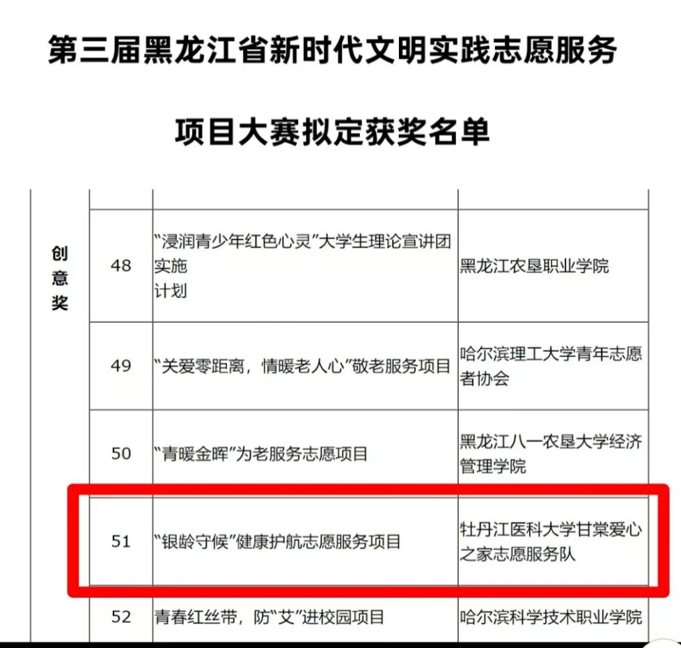 近日,由省委社会工作部、省委宣传部(省文明办)举办的第三届全省新时代文明实践志愿服务项目大赛落下帷幕。经过申报推荐、资格审查、评委终评等环节比拼,由牡丹江医科大学基础医学院学生党总支第一学生党支部书记万雷指导,甘棠爱心之家2023级临床17班学生李旭东带领团队参与的“银龄守候”健康护航志愿服务项目,在全省500余个项目中脱颖而出,荣获大赛创意奖。