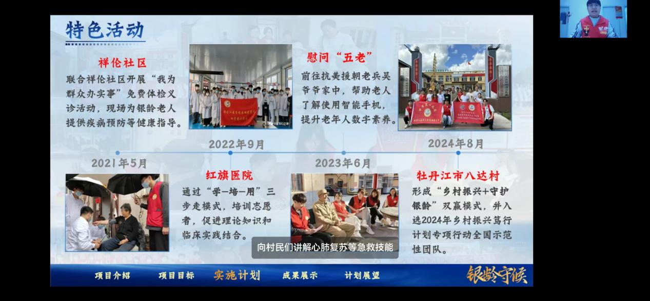 “银龄守候”健康护航志愿服务项目是牡丹江医科大学基础医学院甘棠爱心之家开展的一项以提升当地银龄人群健康水平、促进在校大学生参与社会实践教育为目的的一项综合性志愿服务活动。此项目主要包含四种方式,包括“义诊+科普”形式志愿服务活动、敬老院基础健康筛查、导诊志愿服务活动和“三下乡”华彩乡村卫生宣讲。服务对象涵盖敬老院老人、社区居民、乡村百姓及医院就诊患者四大人群。医疗志愿服务项目的开展,让在校大学生依托医学院校资源,发挥自身能力和优势,培养了他们的仁爱之心、沟通能力和团队协作精神,为未来的医疗职业生涯奠定了坚实的基础。