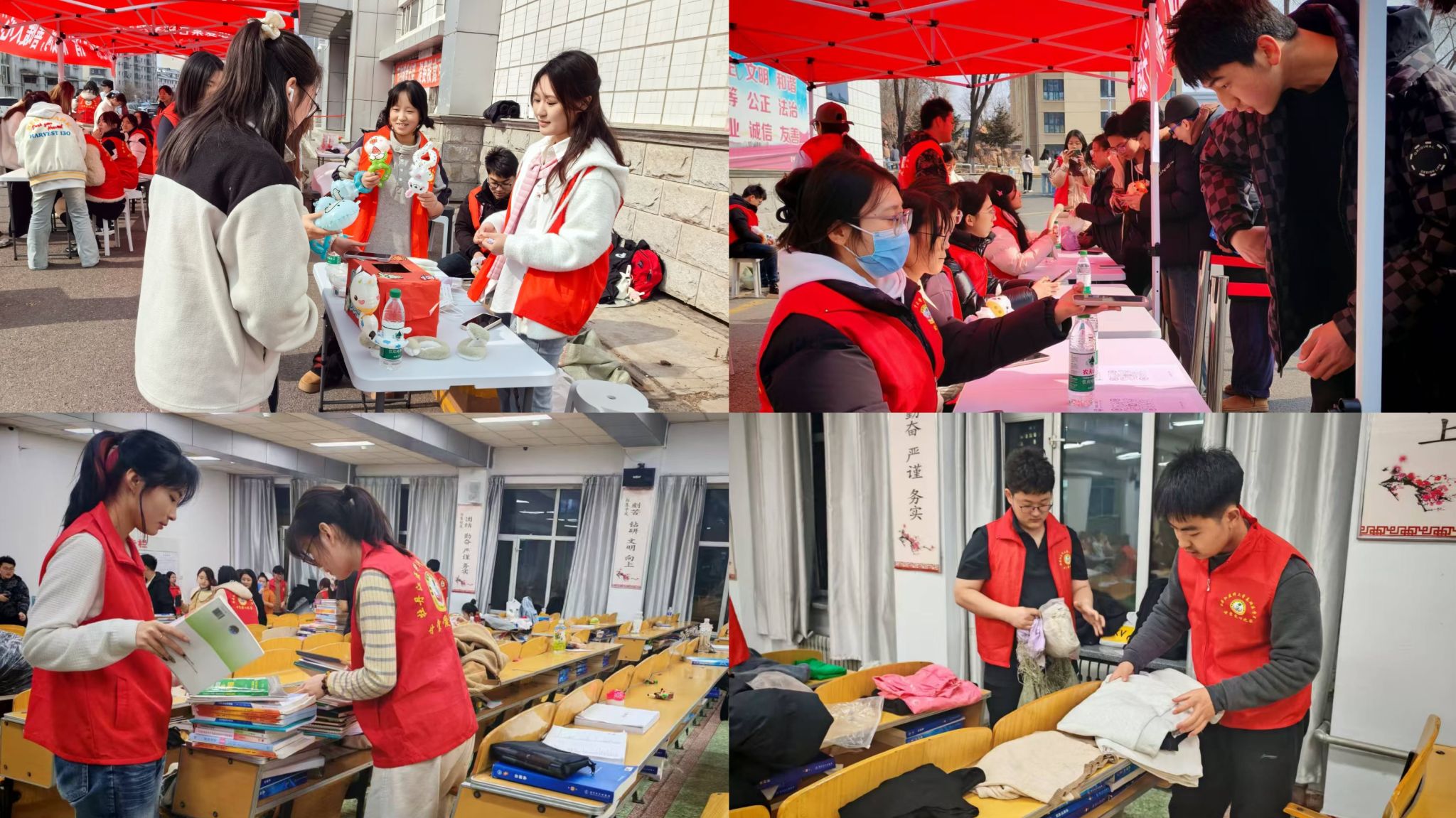 活动前夕,甘棠爱心之家通过多渠道广泛宣传,全校师生积极响应,踊跃参与募捐活动。中午,志愿者们提前在食堂门口布置好场地,身穿红色马甲,迅速投入活动的准备工作中,还有穿着玩偶服的志愿者与同学们进行亲切互动,用欢声笑语传递温暖与正能量,让每位参与者都感受到了浓浓的温情。感兴趣的同学纷纷驻足了解详细内容,不久就有同学前来捐赠书本、衣物等教育及生活类用品。志愿者们认真登记捐赠信息,小心翼翼地整理和收纳每一件物品,现场秩序井然。每一件物品都是牡医学子的爱心捐助,也代表着青年一代躬身力行的志愿服务情怀。