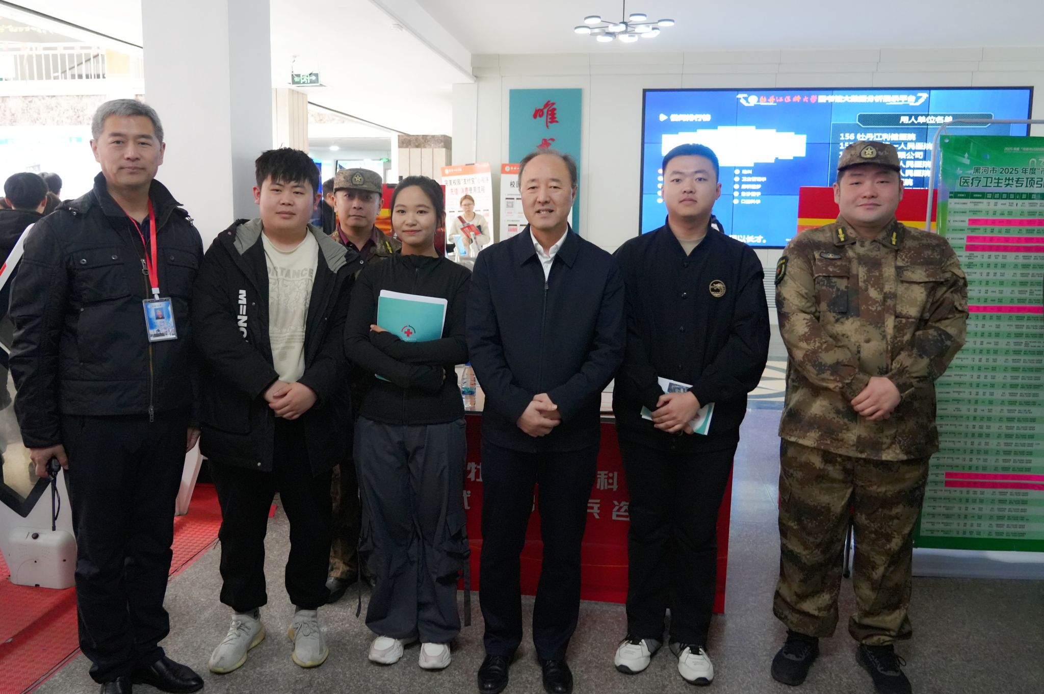 马宏坤详细询问了我校去年征兵情况以及今年春季征兵报名、体检、役前训练、应征入伍、退役大学生士兵复学转专业等情况,并与退役大学生及有应征意愿的大学生亲切交谈,并对学校征兵工作提出要求,明确征兵工作站要抓住双选会宣传发动之机,以学生实现自我价值、拓宽人生视野、促进高质量就业、投身军营建功立业为目标切实加大应征宣传力度。弓箭在了解学校春季征兵工作的同时强调要密切联系爱民区人武部,发挥学校征兵工作站职能作用,协调各学院做好全年征兵工作并加强全民国防教育。朱晓冬鼓励大学生踊跃报名应征,实现报国之志,希望退役大学生发挥引导作用,展现军人风采,助推学校征兵事业。武装部向校领导汇报了我校去年应征入伍24人,较好地完成了年度征兵工作,并表示在2025年会积极推动征兵工作创造出更好的成绩。