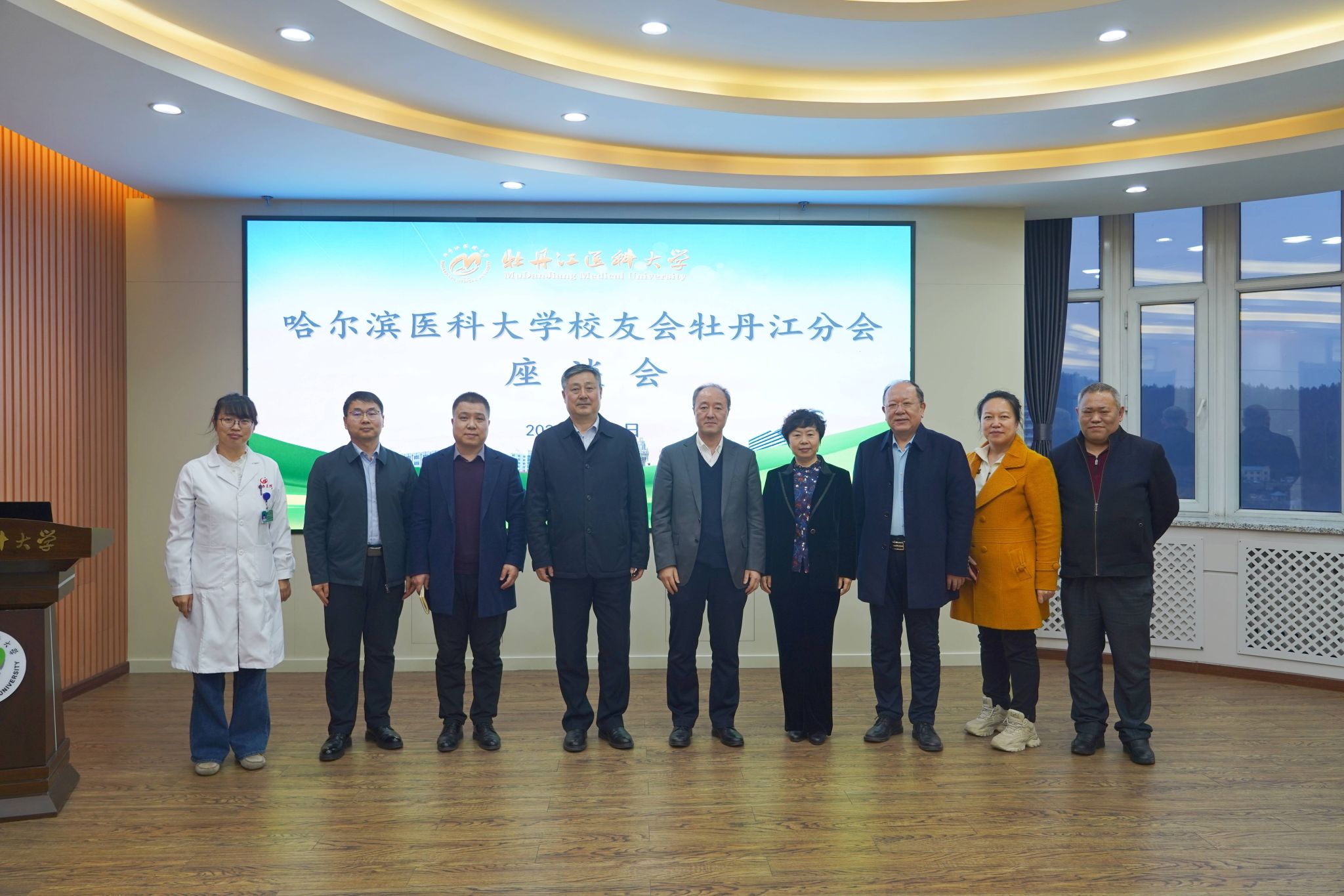共叙校友情谊,共谋发展新篇。为深化校际合作、凝聚校友力量,共同迎接哈尔滨医科大学百年校庆,2025年4月1日,哈尔滨医科大学机关党委书记、校友会会长袁重胜,哈尔滨医科大学党委常委、中国疾病预防控制中心地方病控制中心主任、哈尔滨医科大学副校长、校友会副会长高彦辉,哈尔滨医科大学学校办公室主任徐威一行到访学校,专题商议成立哈尔滨医科大学牡丹江校友会事宜。牡丹江医科大学党委书记马宏坤,口腔医学院原院长石屹,牡丹江市肿瘤医院党委书记孙波,牡丹江市第二人民医院内分泌科主任马雪松,牡丹江市疾病预防控制中心副主任纪树贵,牡丹江市中医院副院长王振涛,牡丹江医科大学附属红旗医院神经内三科负责人赵维纳,牡丹江医科大学科研处副处长荣胜忠等参加座谈会。座谈会由马宏坤主持,双方围绕校友会建设、科研协同创新等议题展开深入交流,共绘校际合作蓝图。
