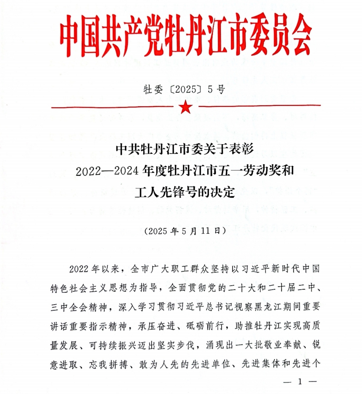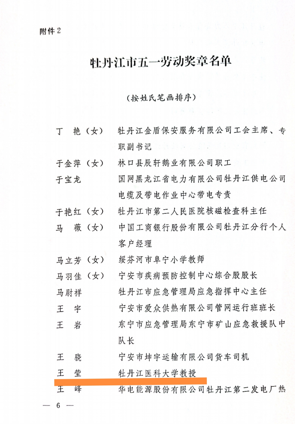 近日,牡丹江市委发布了《中共牡丹江市委关于表彰2022-2024年度牡丹江市五一劳动奖和工人先锋号的决定》(牡委〔2025〕5号)文件,我校基础医学院王莹教授荣获牡丹江市五一劳动奖章荣誉称号。