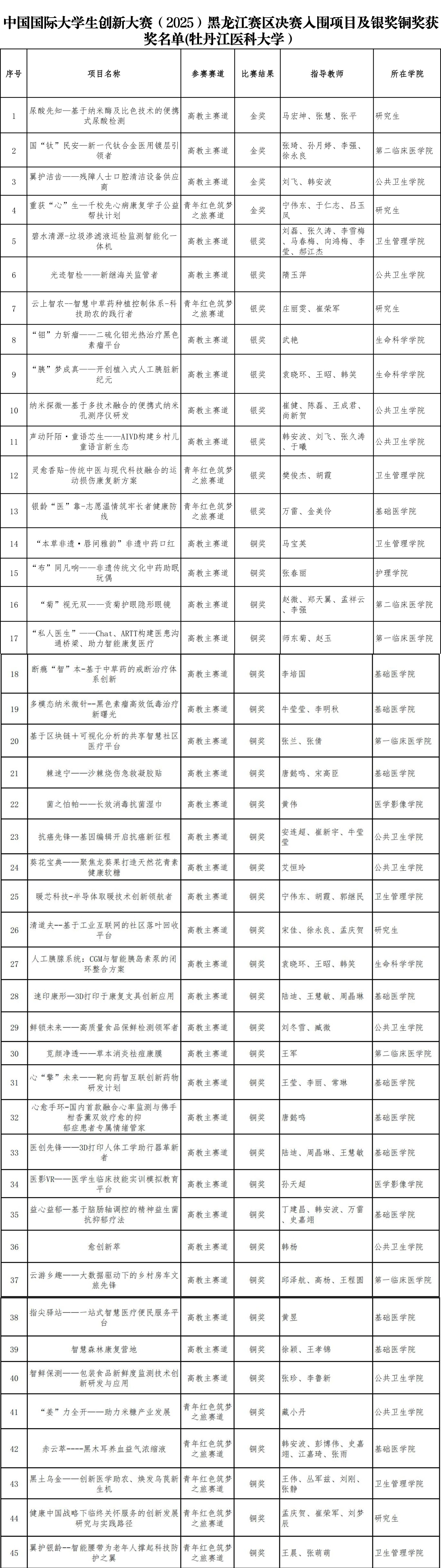近日,2025年中国国际大学生创新大赛省赛结果揭晓,我校以总计45项大奖的辉煌战绩刷新校史纪录!其中,勇夺金奖4项、银奖9项、铜奖32项,创造获奖项目新纪录。同时,我校凭借卓越的组织工作,获得中国国际创新大赛黑龙江赛区优秀组织奖。这一系列突破性成果是我校深化创新创业教育改革、提升人才培养质量的生动体现。