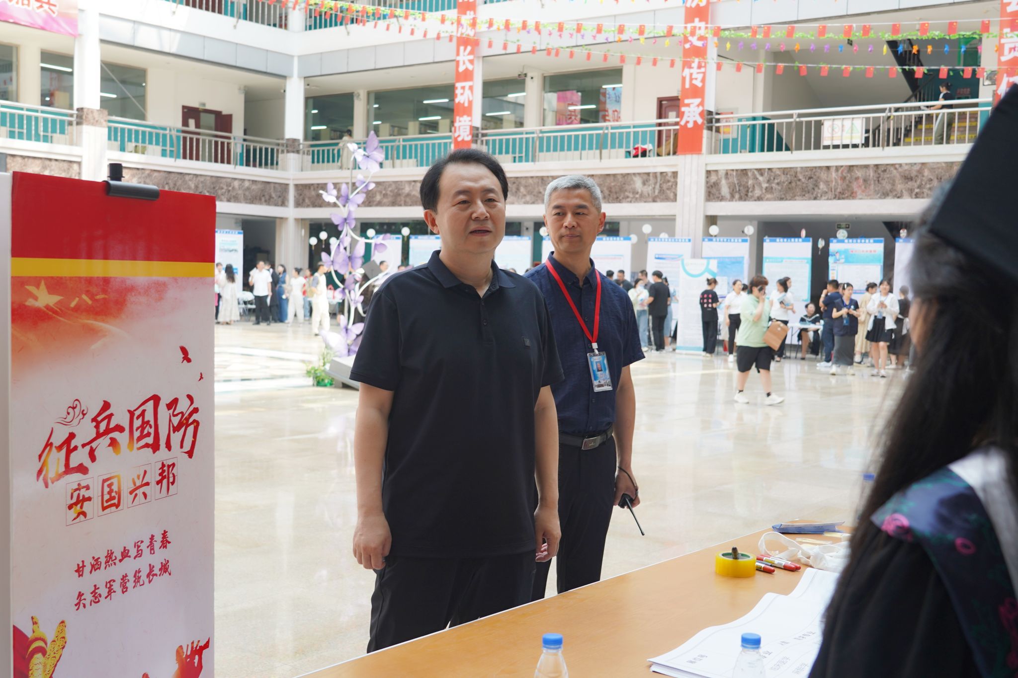 为深入推进我校大学生征兵工作,加大征兵政策宣传力度,激励广大应届毕业生踊跃报名应征,6月24日上午,我校武装部借助学校毕业生双选会之机,对应届毕业生开展征兵政策宣传活动。学校党委副书记弓箭、副校长宋高臣亲临征兵政策宣传现场。
