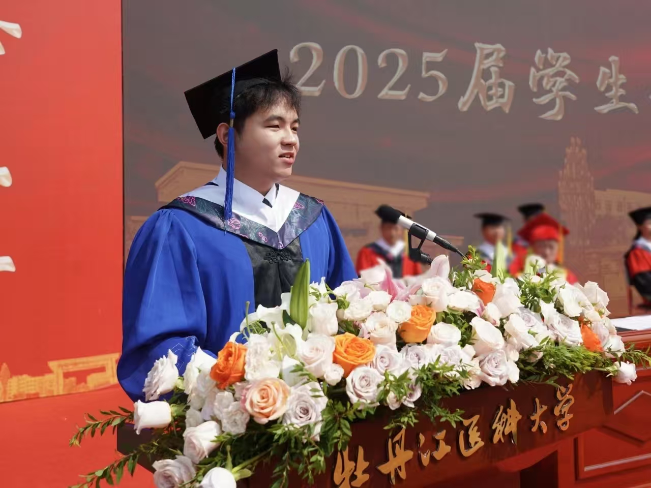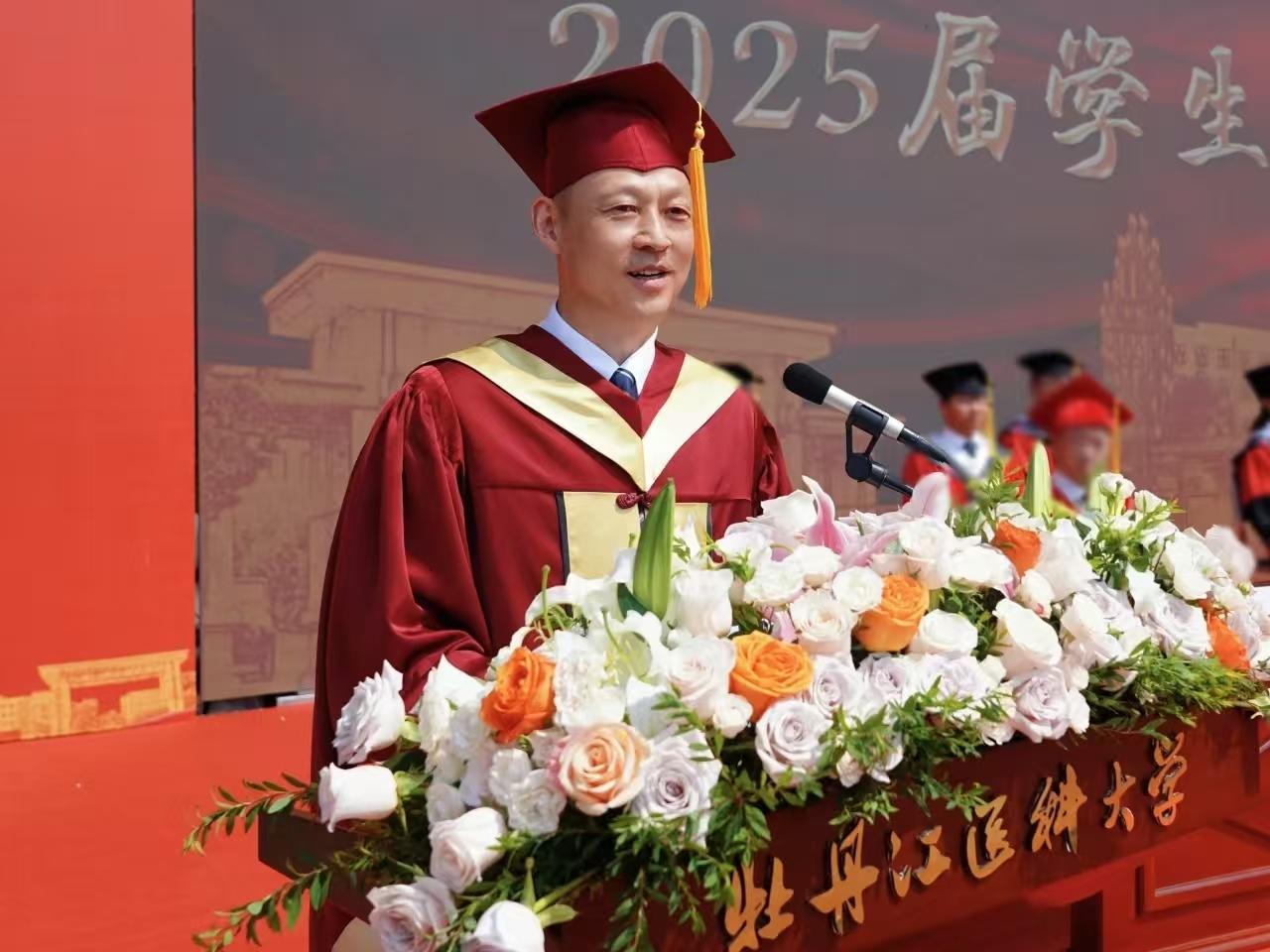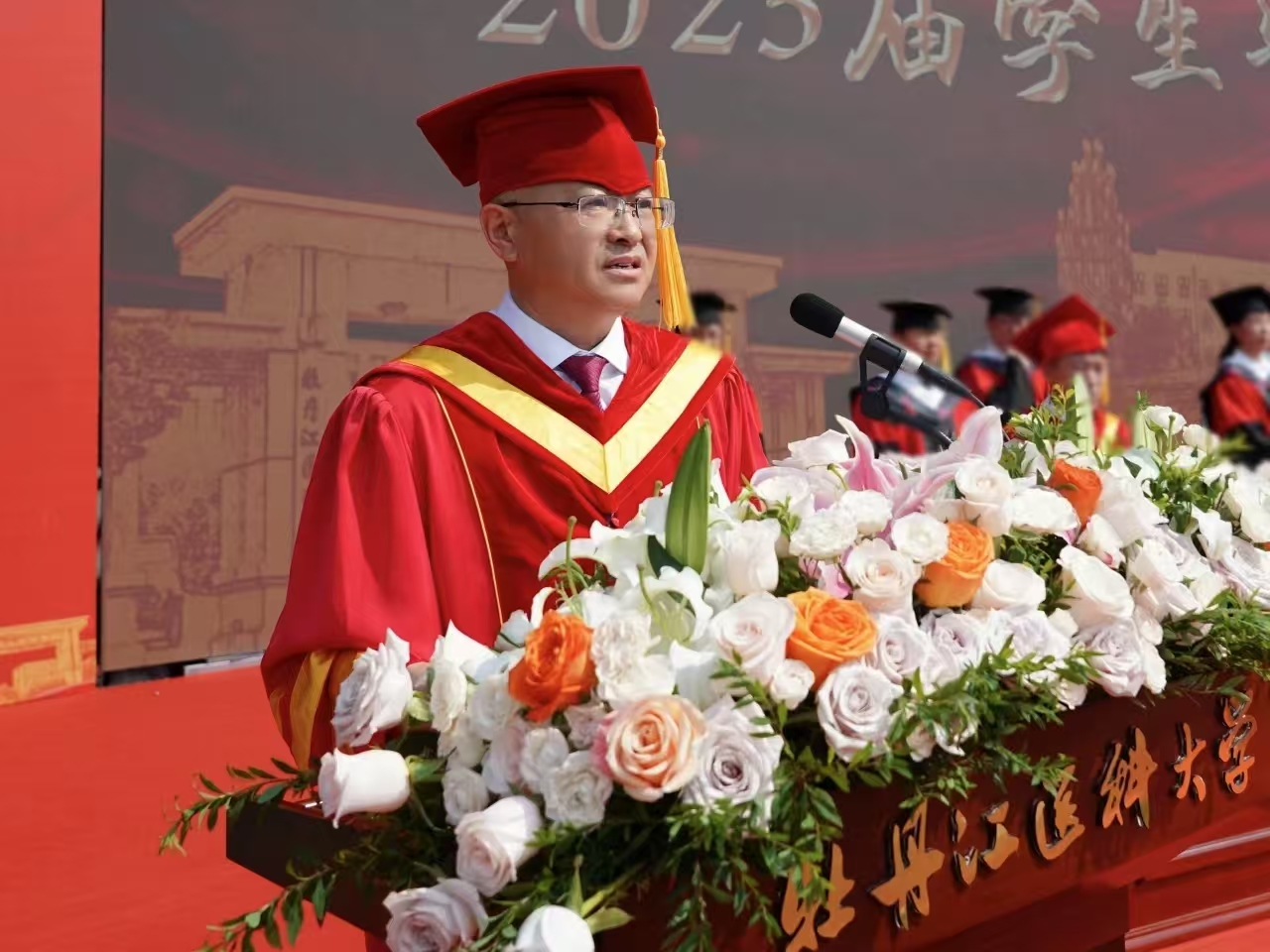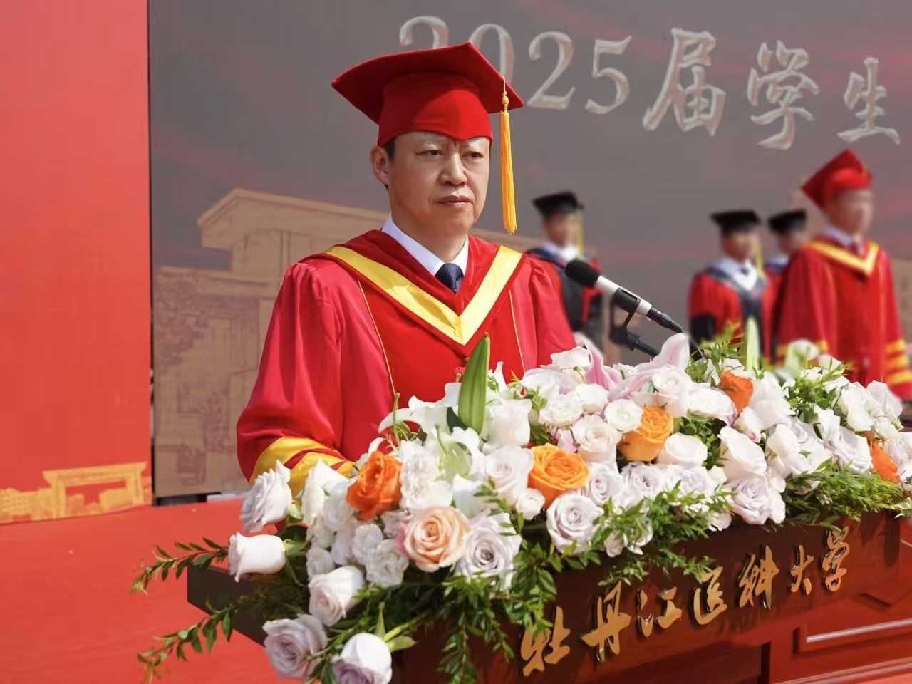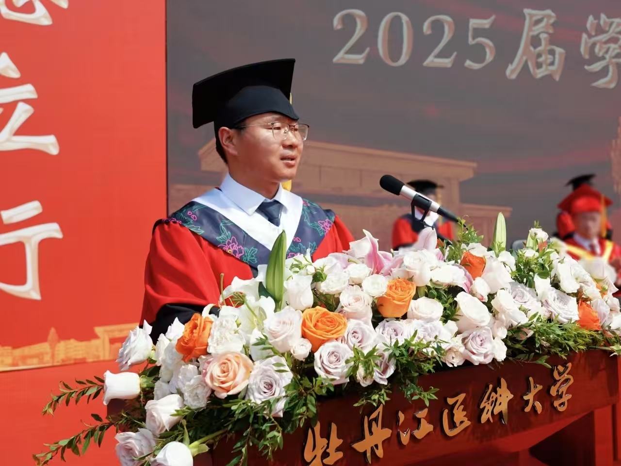 “未来的你们,或许身着白袍奋战在急诊一线,与时间赛跑抢救生命;或许埋首实验室攻克医学难题,为人类健康开拓新疆界;或许扎根基层乡野,为乡村振兴奉献青春”。李春江校长在致辞中说,我们共同走过祖国阔步向前的征程、见证母校日新月异的跨越,同学们的青春故事,将成为心底最珍贵的收藏,凝结成青春牡医最美的诗篇。他赠言同学们,厚植家国情,做健康中国的“忠实守护者”,将个人理想融入健康中国建设的宏伟蓝图,以仁心仁术守护人民生命健康;常怀救苦心,做AI时代的“温度传感器”,永葆解除病痛的初心,在医学探索的征途中,以“唯实唯新”的锐气勇闯科研“无人区”,始终将人文温度作为技术创新的灵魂与归宿;砥砺奋斗志,做终身学习的“医学特种兵”,以终身学习锻造过硬本领,时刻准备应对医学领域的复杂挑战与突发状况,以如临深渊、如履薄冰的谨慎守护生命,用大爱和专业筑起健康的钢铁长城。