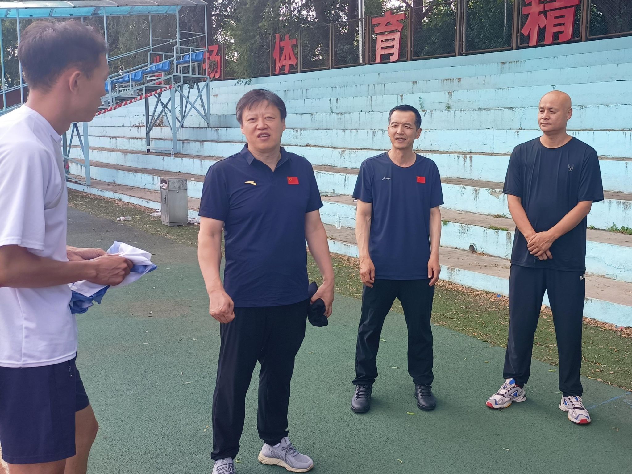 宋高臣逐一走访各项目训练场地,实地观看了运动员们的训练情况,并听取相关负责人的备战汇报,与教练员、运动员代表进行了深入交流。他详细询问了运动员们的训练强度、生活保障及身体状况,尤其对高温天气下的防暑降温措施进行了重点了解。看到运动员们不畏酷暑、刻苦训练,宋高臣高度赞扬了他们顽强拼搏的精神和阶段性的训练成果。