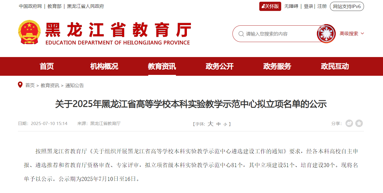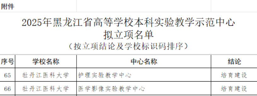 近日,黑龙江省教育厅公示了2025年黑龙江省高等学校本科实验教学示范中心拟立项名单,其中拟立项省级本科实验教学示范中心81个,其中立项建设51个、培育建设30个。我校申报的“护理实验教学中心”“医学影像实验教学中心”均成功获批培育建设立项。