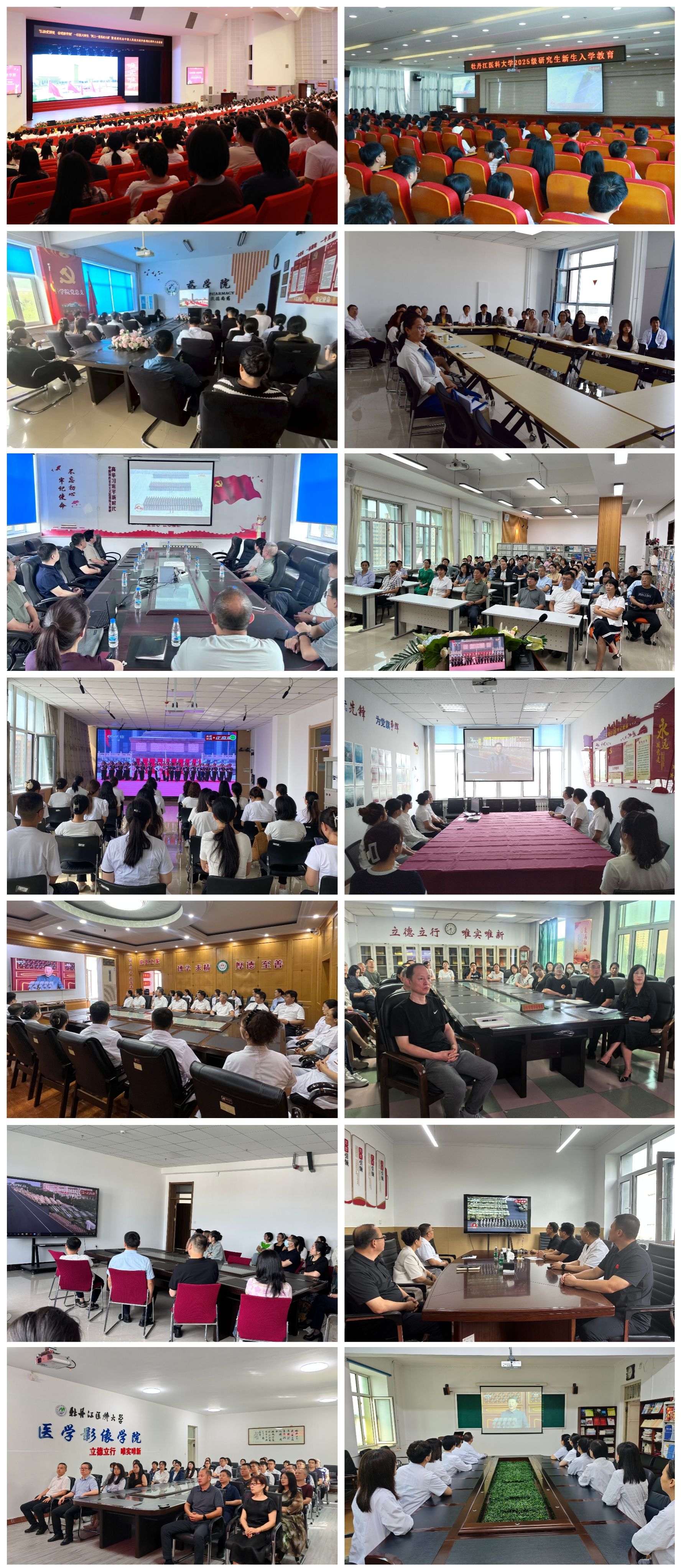 9月3日上午9时,牡丹江医科大学组织广大师生集中观看纪念中国人民抗日战争暨世界反法西斯战争胜利80周年大会盛况。学校全体领导班子成员及机关党员代表在办公楼六楼会议室集中观看,13个基层党委(直属党总支)分别在文体馆、综合实训楼17楼大会议室等开设14个集中观看场所,确保全校领导干部和师生同上这一堂生动的爱国主义教育课,更深刻地铭记历史、缅怀先烈,增强民族自豪感和责任感,营造爱国奋进、团结向上的校园氛围。