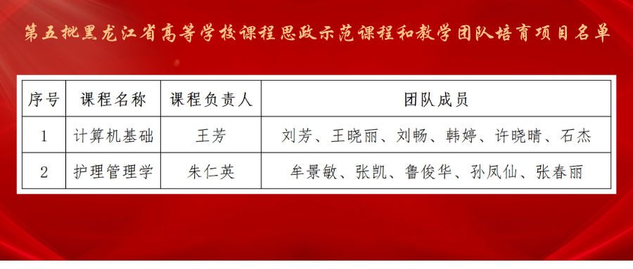 现代教育技术中心王芳老师主讲的《计算机基础》和护理学院朱仁英老师主讲的《护理管理学》2门课程及团队获批第五批黑龙江省高等学校课程思政示范课程和教学团队培育项目。