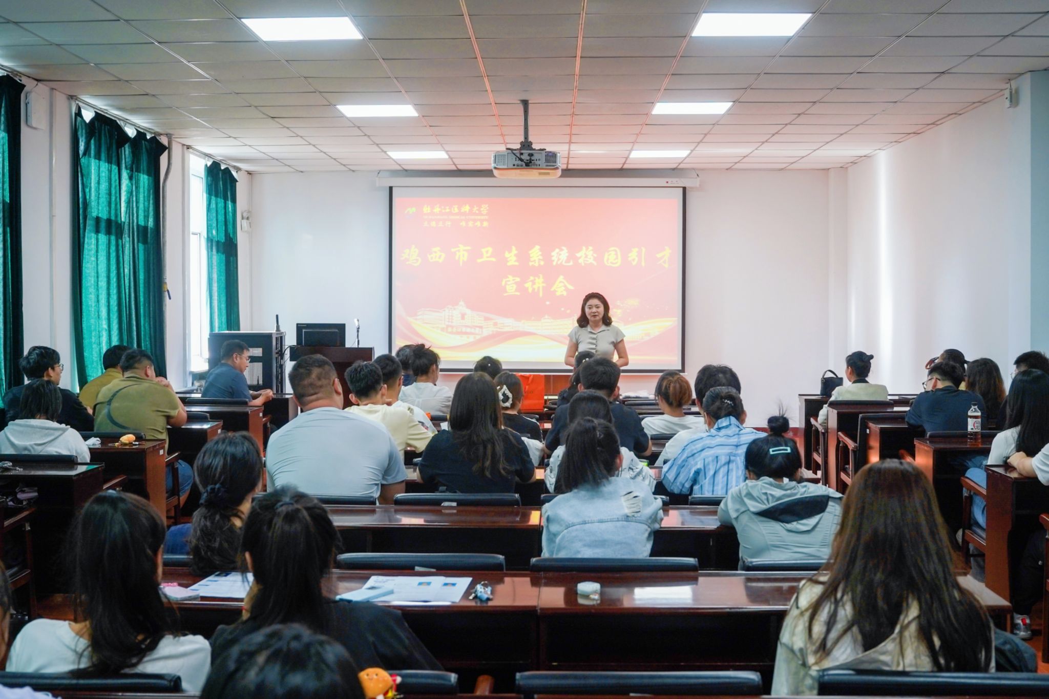 9月11日下午,鸡西市人民医院、鸡西市疾控中心、鸡西市精神病医院及虎林市人民医院等四家单位来我校,面向2026届毕业生举办医疗人才专场招聘宣讲会。学校党委副书记弓箭与鸡西市卫生系统四家单位代表进行了访企拓岗专项交流。