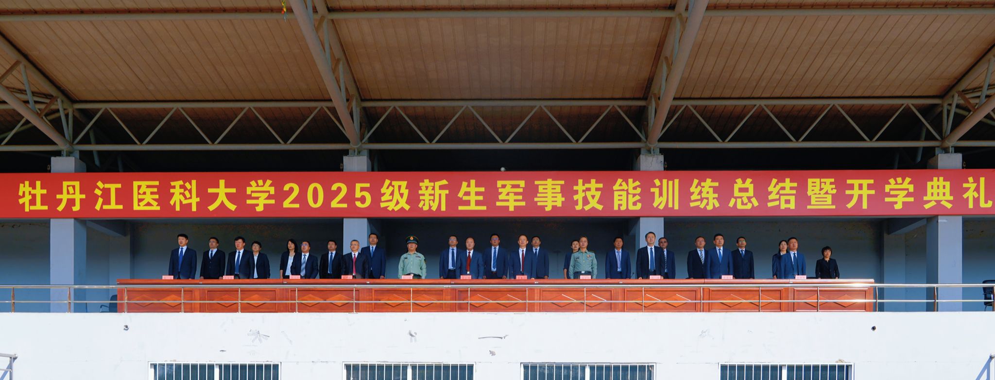 2025年9月13日上午,牡丹江医科大学2025级新生军训总结大会暨开学典礼在学校运动场隆重举行。学校领导班子全体成员,各学院党委(党总支)书记、院长,学校办公室、学生工作部(学生处)、团委、教务处、招生就业处等职能部门负责人共同出席。武警牡丹江支队上校支队长刘宇、牡丹江市爱民区武装部上校政委闫守利作为特邀嘉宾出席典礼。
