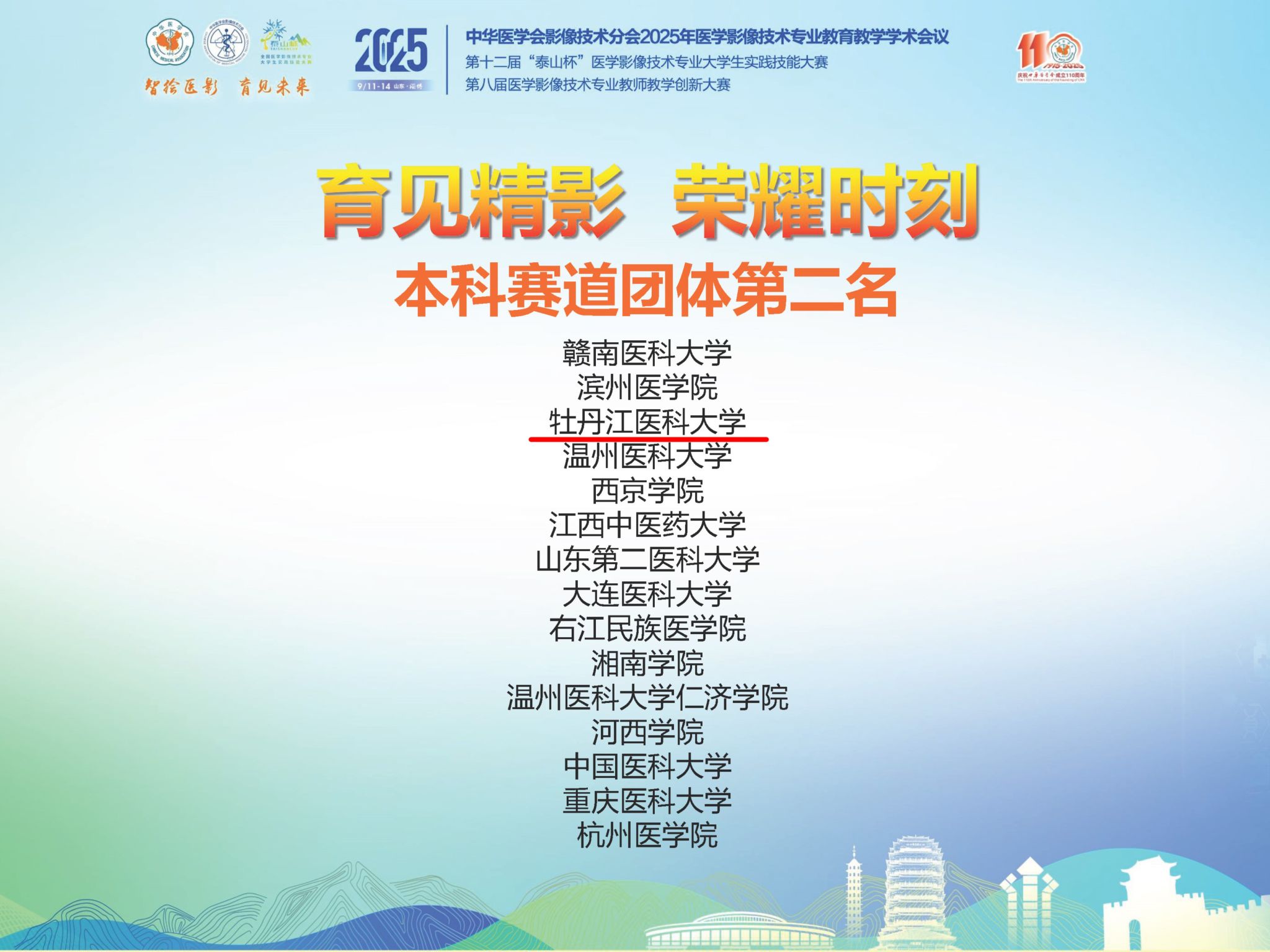 2025年9月11日-14日,第十二届“泰山杯”全国医学影像技术专业(本科)大学生实践技能大赛、第八届全国医学影像技术专业青年教师教学创新大赛暨全国医学影像技术专业教育教学研讨会在山东淄博举行。本次大赛由中华医学会、中华医学会影像技术分会主办,齐鲁医药学院、山东医学高等专科学校等8家单位联合承办,人民卫生出版社协办。经过全国分区初赛选拔,共有46所本科院校成功晋级决赛。学校参赛选手在比赛中顽强拼搏、沉着应对,凭借扎实的理论知识、娴熟的实践技能和良好的人文素养,荣获团体第二名,尽显团队协作的强劲实力,总成绩在46所院校中排第11位。个人项目尹永菲获MRI检查技术第一名,晁嘉馨获DR检查技术第三名,袁贤锋获CT检查技术第三名,李宗鉴获医学影像诊断第三名。教师宋爽凭借深厚的专业基础、扎实的教学功底及特色鲜明的教学风格,获教学创新大赛第三名。