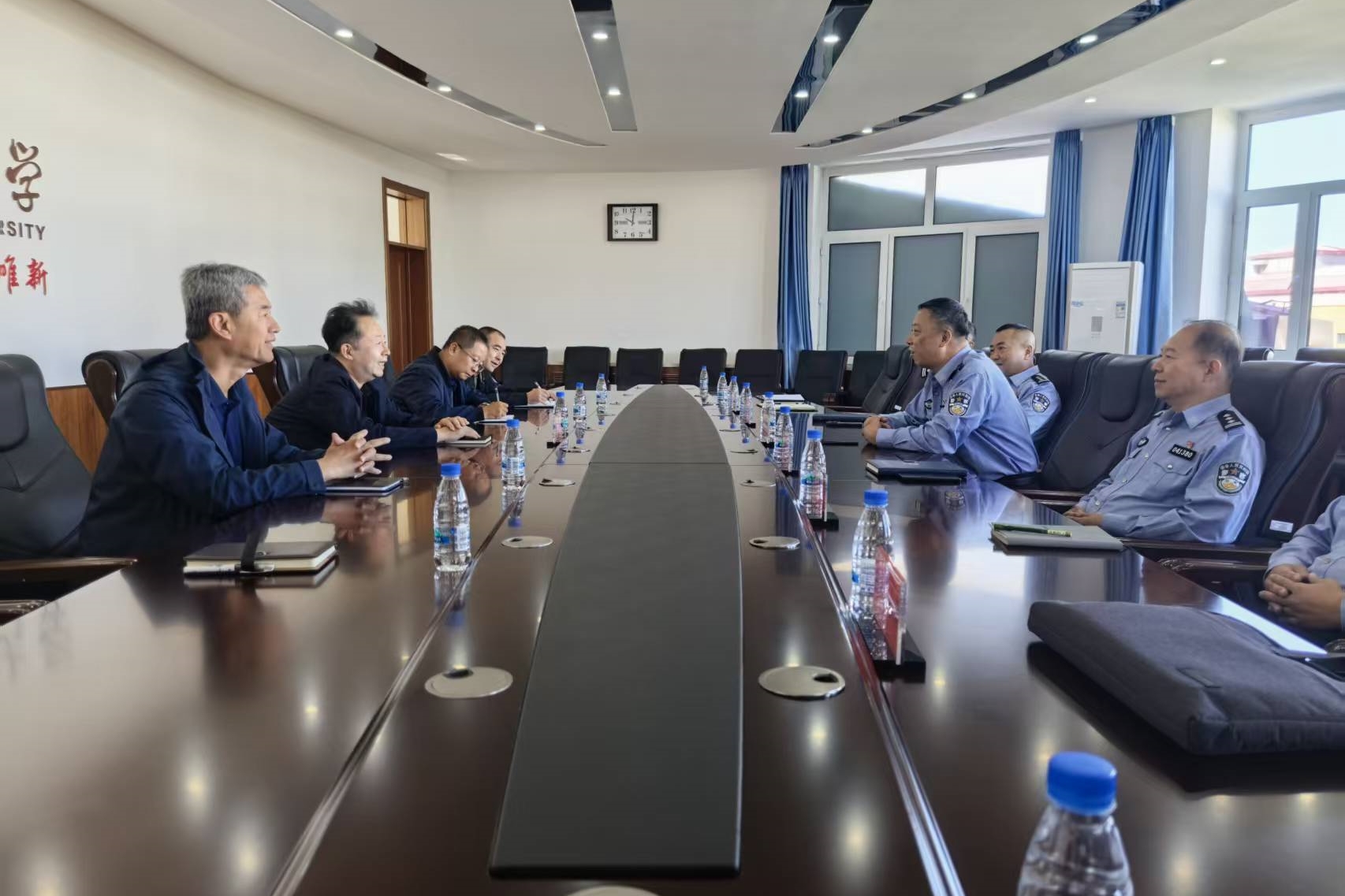 2025年9月19日上午,牡丹江市爱民区副区长、市公安局爱民分局局长刘祥平和副局长梅永刚率领政保大队、治安大队、反恐大队和向阳派出所等相关部门负责人来到学校,针对深入推进警校合作及构建平安校园进行调研。学校党委副书记弓箭、保卫处处长张天韧等陪同调研。