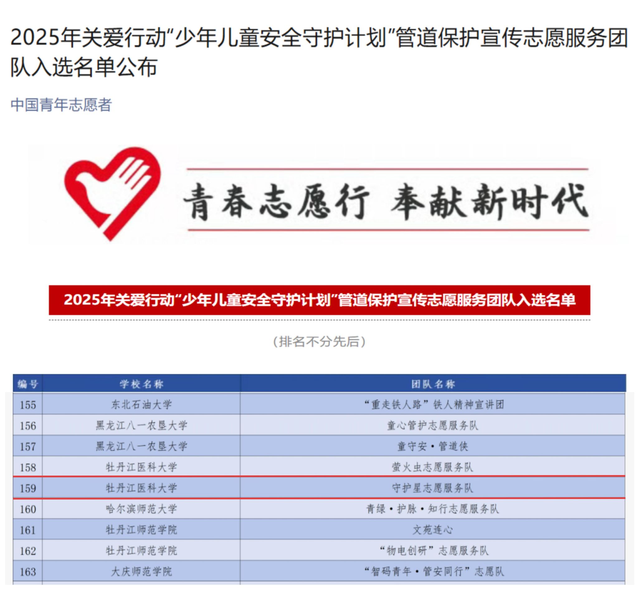 近日,2025年关爱行动“少年儿童安全守护计划”管道保护宣传志愿服务团队遴选工作圆满落幕。该活动由团中央青年志愿者行动指导中心、中国少年儿童新闻出版总社、国家石油天然气管网集团联合发起,经过全国596所高校团队的激烈角逐,我校团委指导并组织推报、由基础医学院组建的萤火虫志愿服务队与守护星志愿服务队,凭借过硬实力在评选中脱颖而出,成功入选该计划管道保护宣传志愿服务团队,为校园志愿服务品牌再添亮眼成绩。