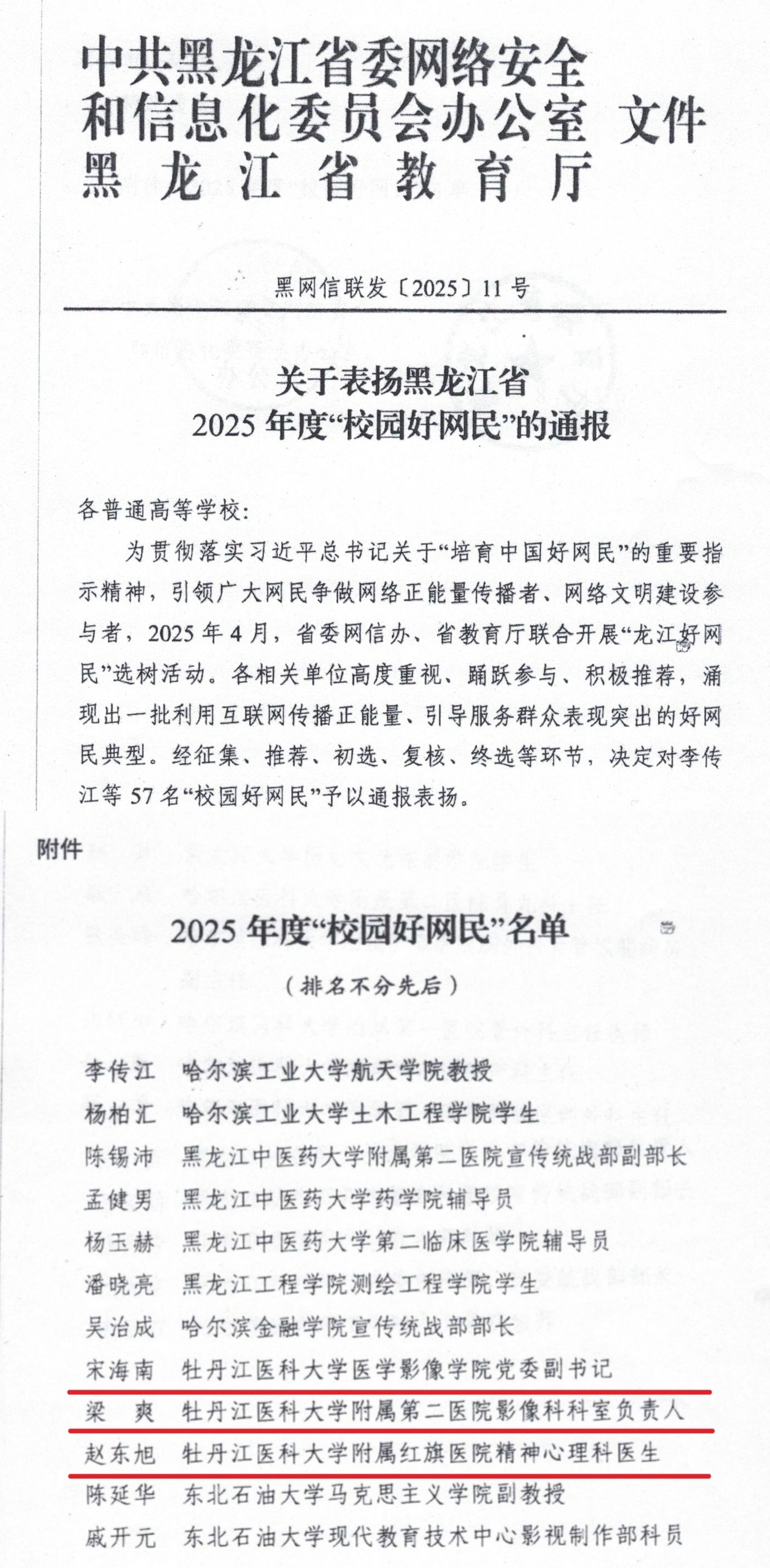 近日,中共黑龙江省委网络安全和信息化委员会办公室与黑龙江省教育厅联合印发了《关于表扬黑龙江省2025年度“校园好网民”的通报》。经过严格的征集、推荐、初选、复核及终选等评审程序,我校宋海南、梁爽、赵东旭3名教职工获评黑龙江省2025年度“校园好网民”。