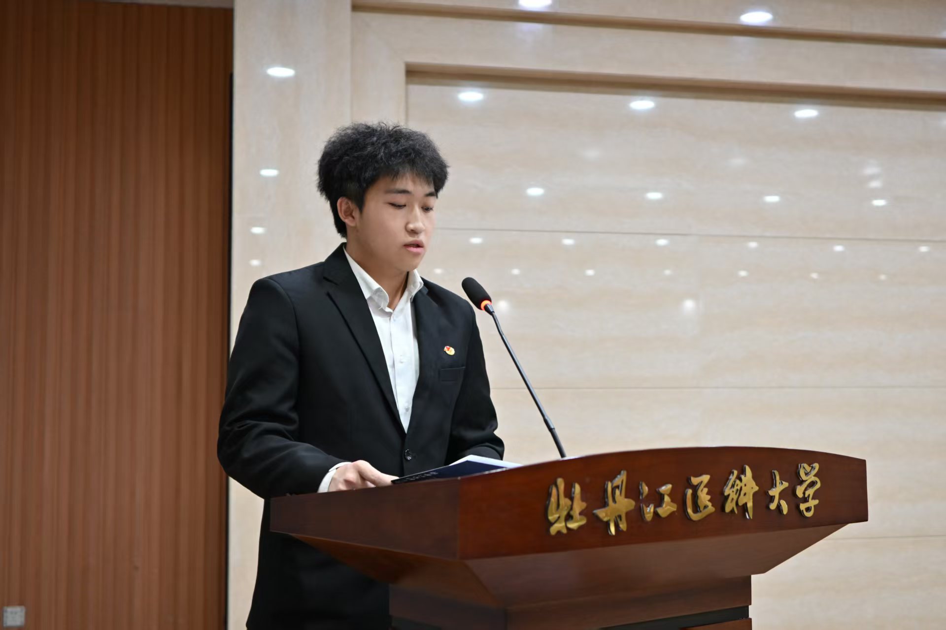 校学生会副主席赵磊作为学员代表发言,他立足医学生身份,分享对“青年马克思主义者”身份的理解,展现新时代医学生的理想情怀与责任担当,并代表全体学员作出“潜心钻研理论、锤炼医学本领”的郑重承诺,引发全场学员强烈共鸣。