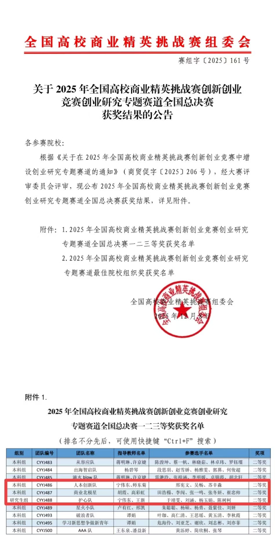 近日,2025年全国高校商业精英挑战赛创新创业竞赛创业研究专题赛道全国总决赛圆满落幕。我校参赛团队凭借扎实专业功底、创新研究思路与出色临场表现,在全国数百所高校队伍的激烈角逐中脱颖而出,斩获全国二等奖3项,为学校再添荣誉。