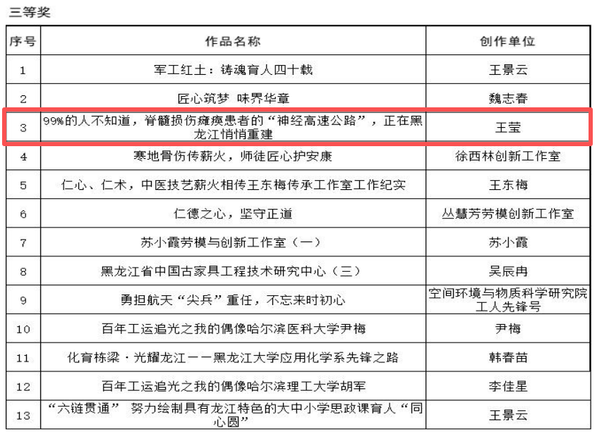 近日,黑龙江省教科文卫体工会发布2025年“岁月十二章”职工岗位“云讲述”活动获奖情况通报,牡丹江医科大学神经组织工程创新工作室王莹教授创作的作品《99%的人不知道,脊髓损伤瘫痪患者的“神经高速公路”,正在黑龙江悄悄重建》荣获三等奖,充分展现了我校职工深耕岗位、勇于创新的精神风貌与过硬的专业素养。该作品以生动的镜头语言、真挚的情感表达,讲述了牡丹江医科大学在科学研究、医疗服务等领域的坚守与探索,生动诠释了新时代高校职工的责任与担当。
