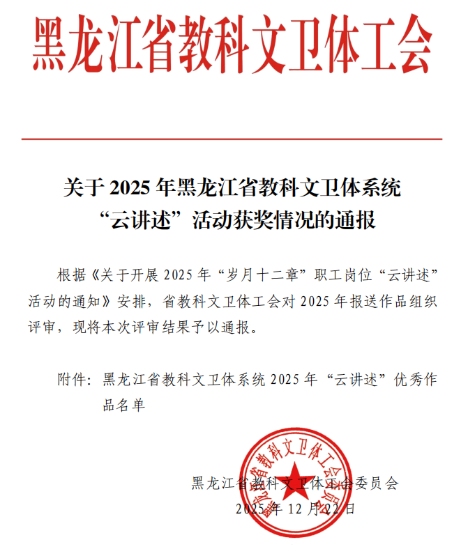 此次获奖是对我校职工岗位创新成果与思政教育成效的充分肯定。学校将以此次活动为契机,进一步弘扬劳模精神、劳动精神、工匠精神,激励广大教职工立足本职、开拓创新,持续深化职工思想政治建设,为学校高质量发展与龙江教育卫生事业进步凝聚更强合力!