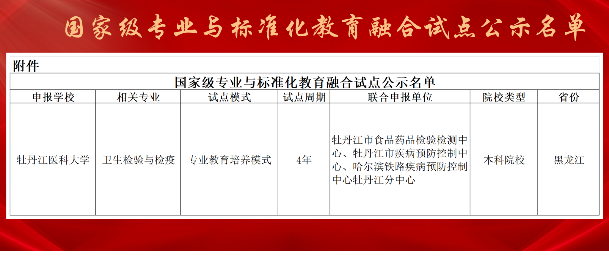 公共卫生学院此次获批的试点项目为“专业教育培养模式”,试点周期4年,联合牡丹江市食品药品检验检测中心、牡丹江市疾病预防控制中心、哈尔滨铁路疾病预防控制中心牡丹江分中心共同建设。项目将依托学院公共卫生与预防医学学科优势,深度对接行业标准与岗位需求,把标准化知识体系融入专业课程与实践教学,打造医药卫生类专业与标准化教育融合的特色路径。