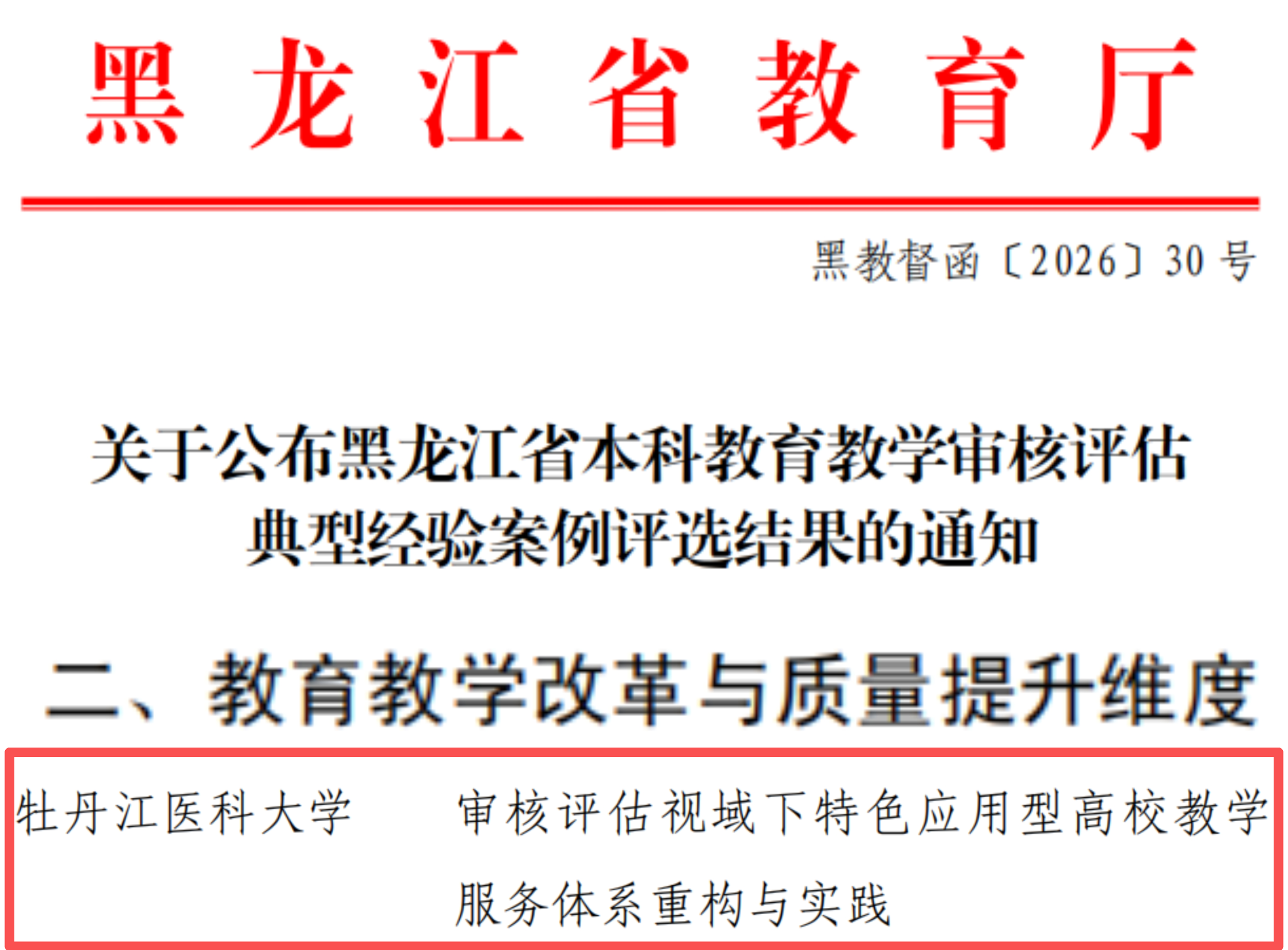 近日,黑龙江省教育厅正式公布新一轮本科教育教学审核评估典型经验案例评选结果,我校申报的《审核评估视域下特色应用型高校教学服务体系重构与实践》案例成功入选。此次入选不仅是对学校教育教学改革成效的充分肯定,也标志着学校在特色应用型人才培养体系建设方面迈出了坚实一步。