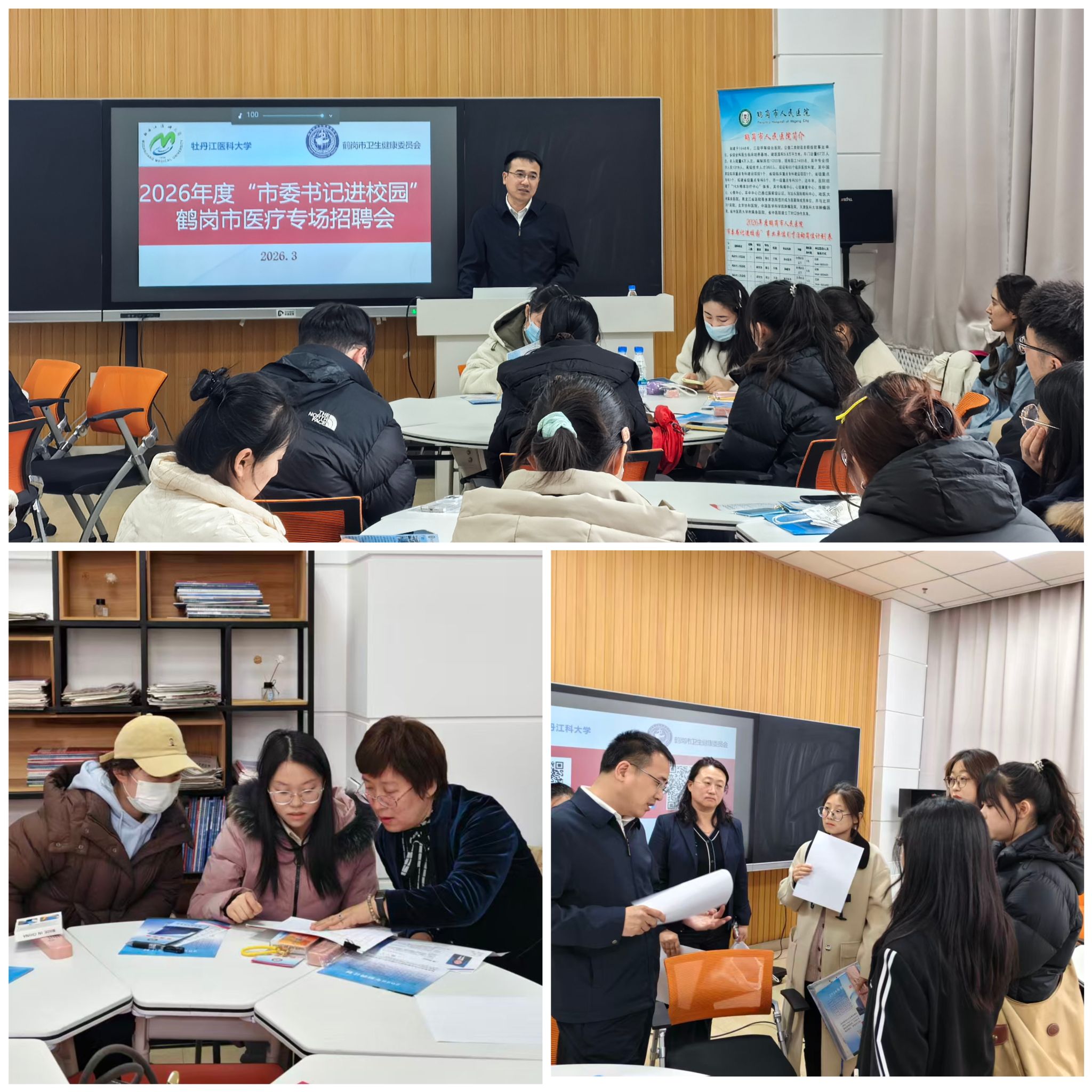 3月19日下午,学校与鹤岗市人民医院、鹤岗市妇幼保健服务中心、鹤岗市疾病预防控制中心、海伦市人民医院在机关楼四楼会议室分别举办就业推进洽谈会。会上,李春江介绍了学校整体发展路径规划和人才培养发展战略,表达了对各单位广纳人才的热烈欢迎,并希望以硕士毕业生就业为契机,长期合作、互利共赢,为社会和医疗卫生行业输送更多高素质专业人才。各来访单位领导也分别介绍了所在单位的发展概况、医疗服务特色及人才需求等情况,并一致表示愿以此次交流为新起点,与学校在毕业生就业推荐、岗位供给、人才培养等方面深化合作。学校教务处和成教学院代表应邀参加会议,共同交流教学基地建设等相关事宜。