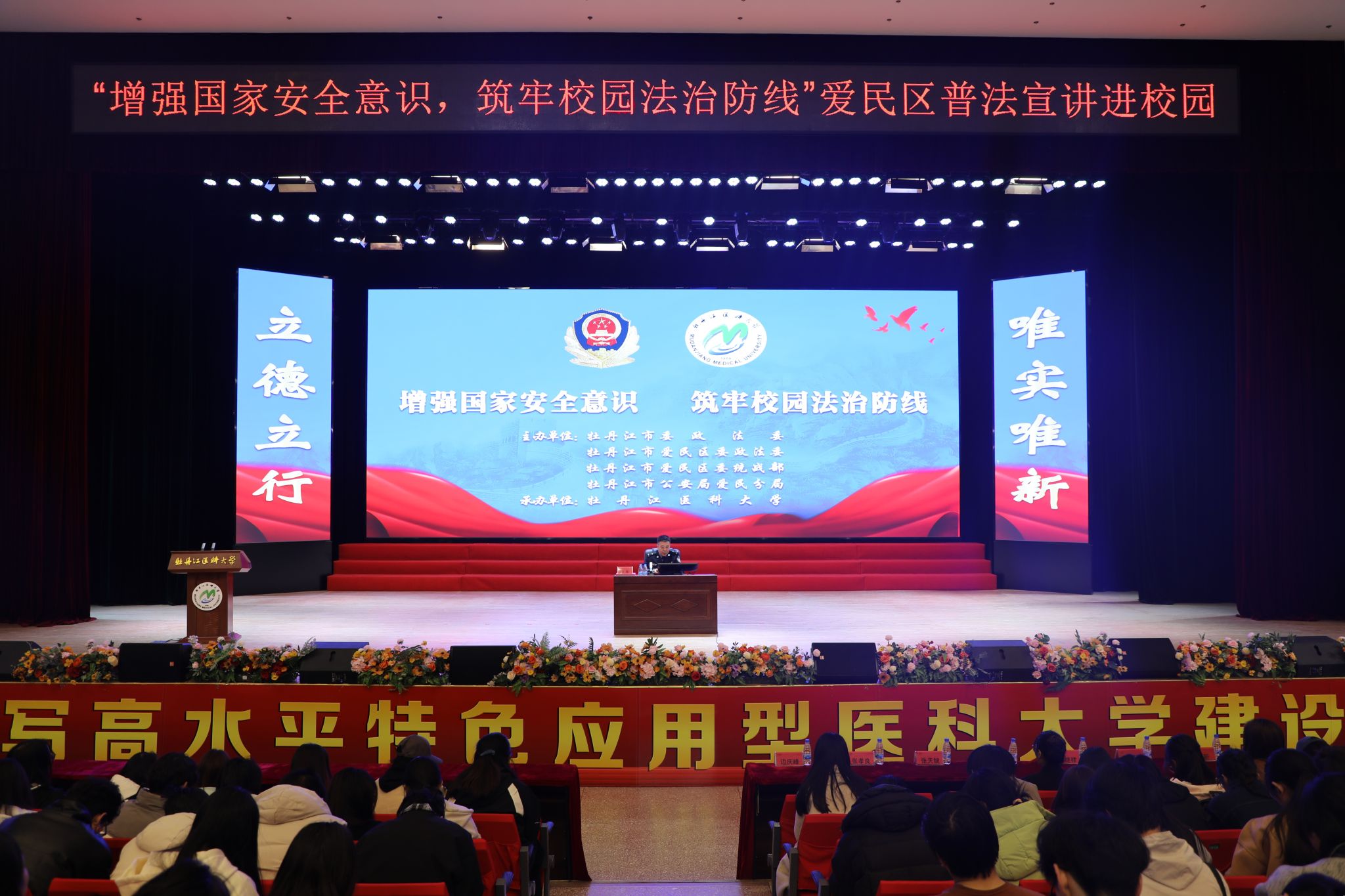 为扎实推进平安校园、法治校园建设,3月26日下午,学校保卫处、团委联合爱民区委政法委开展校园安全法治警示教育活动暨春季返校“安全教育第一课”。市委政法委政治安全科科长刘继祥,爱民区委政法委副书记吴莹,学校保卫处处长张天韧、团委书记王新,牡丹江市公安局爱民分局民警张孝良等出席活动,爱民分局宣讲团成员及师生代表共同参与。