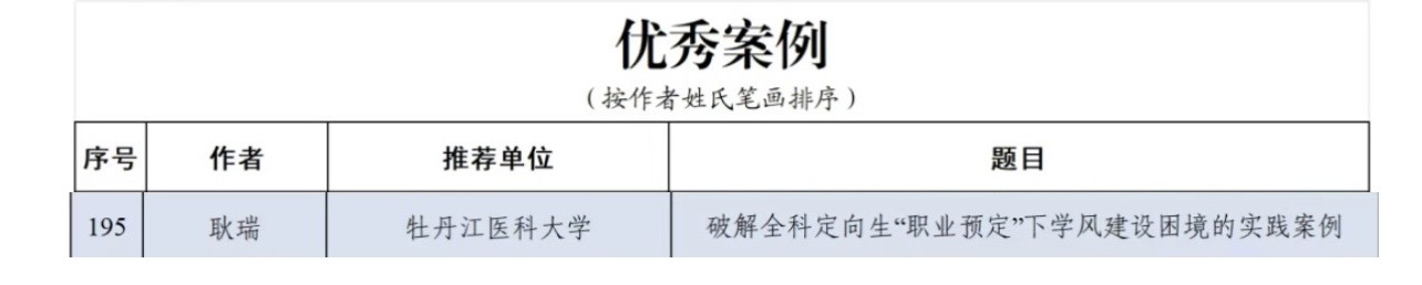 本次文章征集活动面向全国高校思想政治工作队伍,设置研究论文、工作案例、学情分析报告三个类别。我校高度重视、精心组织,经过校内遴选、专家指导和择优推荐,耿瑞老师的案例作品脱颖而出,成功获奖。该案例立足我校全科定向生培养实际,深入剖析“职业预定”背景下的学风建设难点,提出了以价值重塑与内生动力激发为核心的系统性解决方案,充分展现了我校辅导员扎实的理论功底、敏锐的问题意识和丰富的育人实践经验。