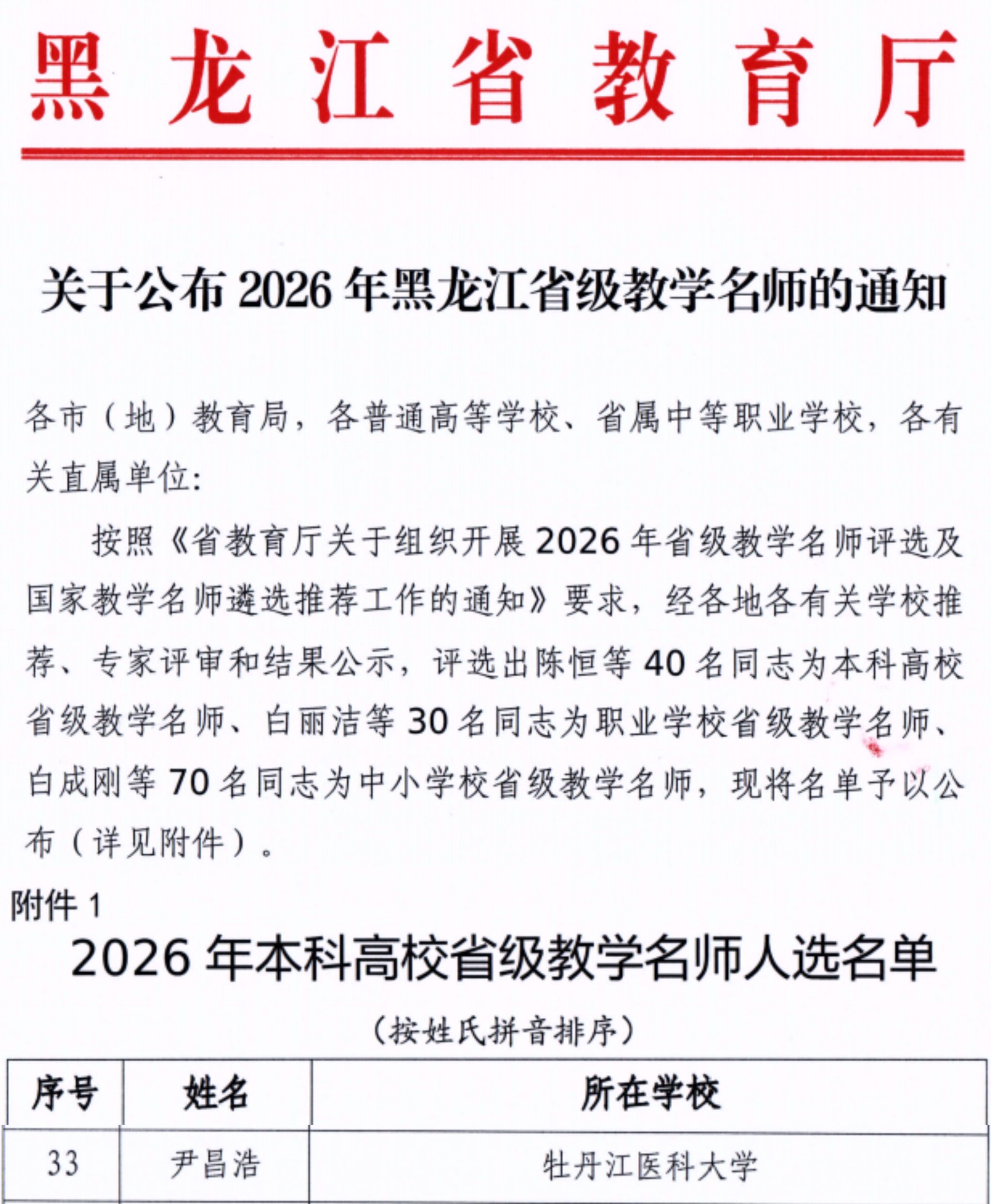 近日,黑龙江省教育厅公布了2026年普通高等学校省级教学名师评选结果,我校尹昌浩教授成功入选,彰显了学校医学教育的教学实力与人才培养质量。