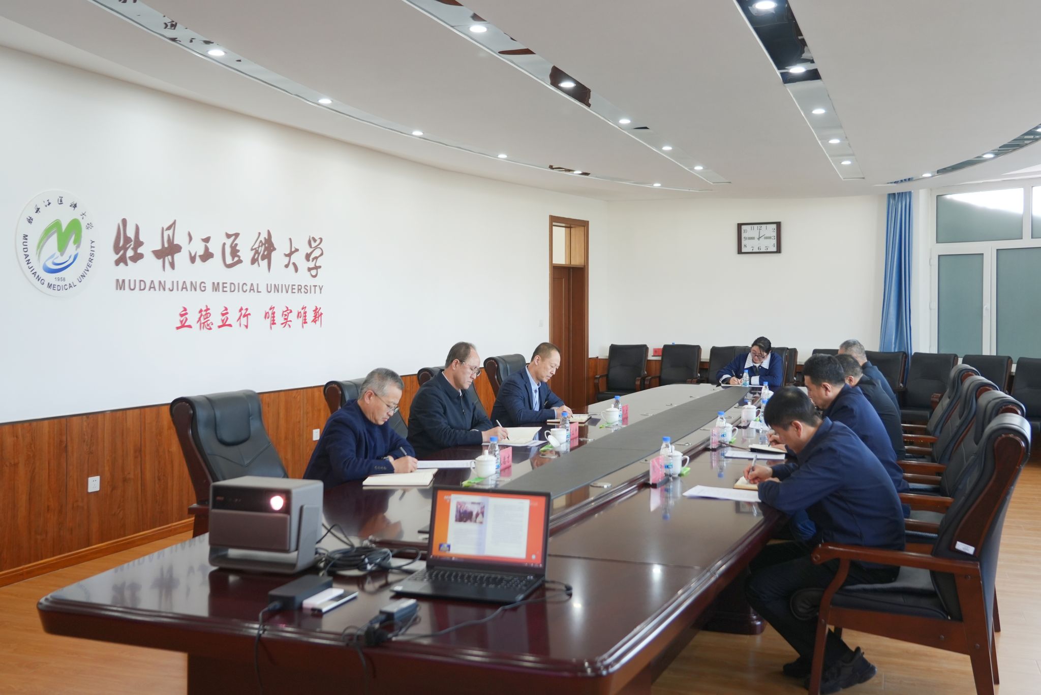 2026年4月24日下午,学校党委书记马宏坤主持学校党委第5次理论学习中心组学习研讨暨“重温嘱托 感恩奋进”专题学习研讨会,领导班子成员李春江、张德才、胡文华、黄海涛、俞春利、张岩参加会议。