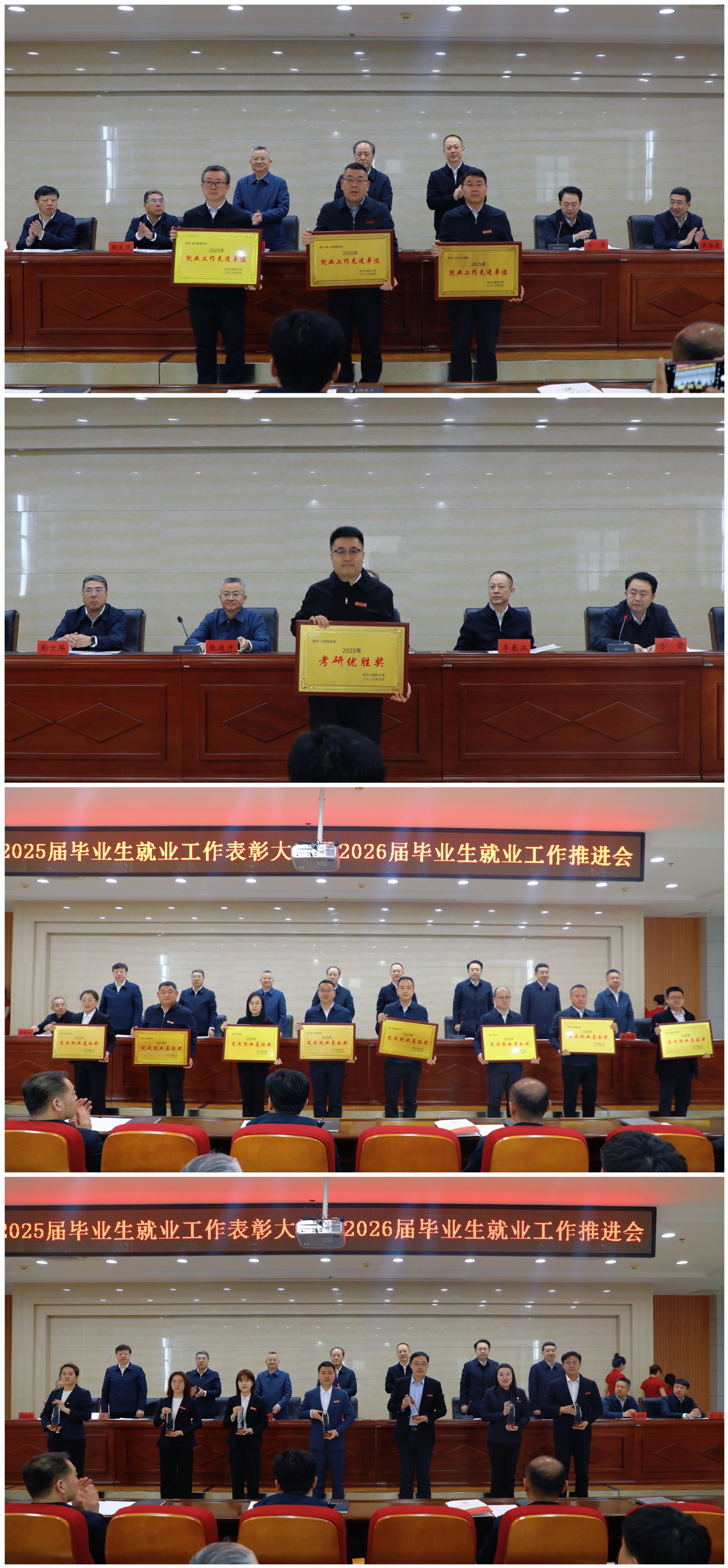 会上,张德才宣读了《关于表彰2025年度就业工作先进集体和先进个人的决定》。第一临床医学院、公共卫生学院和医学影像学院荣获“就业工作先进单位”称号;口腔医学院获“考研优胜奖”;第一临床医学院等8个单位获“完成就业基数奖”;刘飞等7名同志被授予“就业工作先进工作者”荣誉称号。获奖单位代表及个人先后作典型发言,分享了在基层就业引导、精准帮扶及考研指导等方面的宝贵经验。