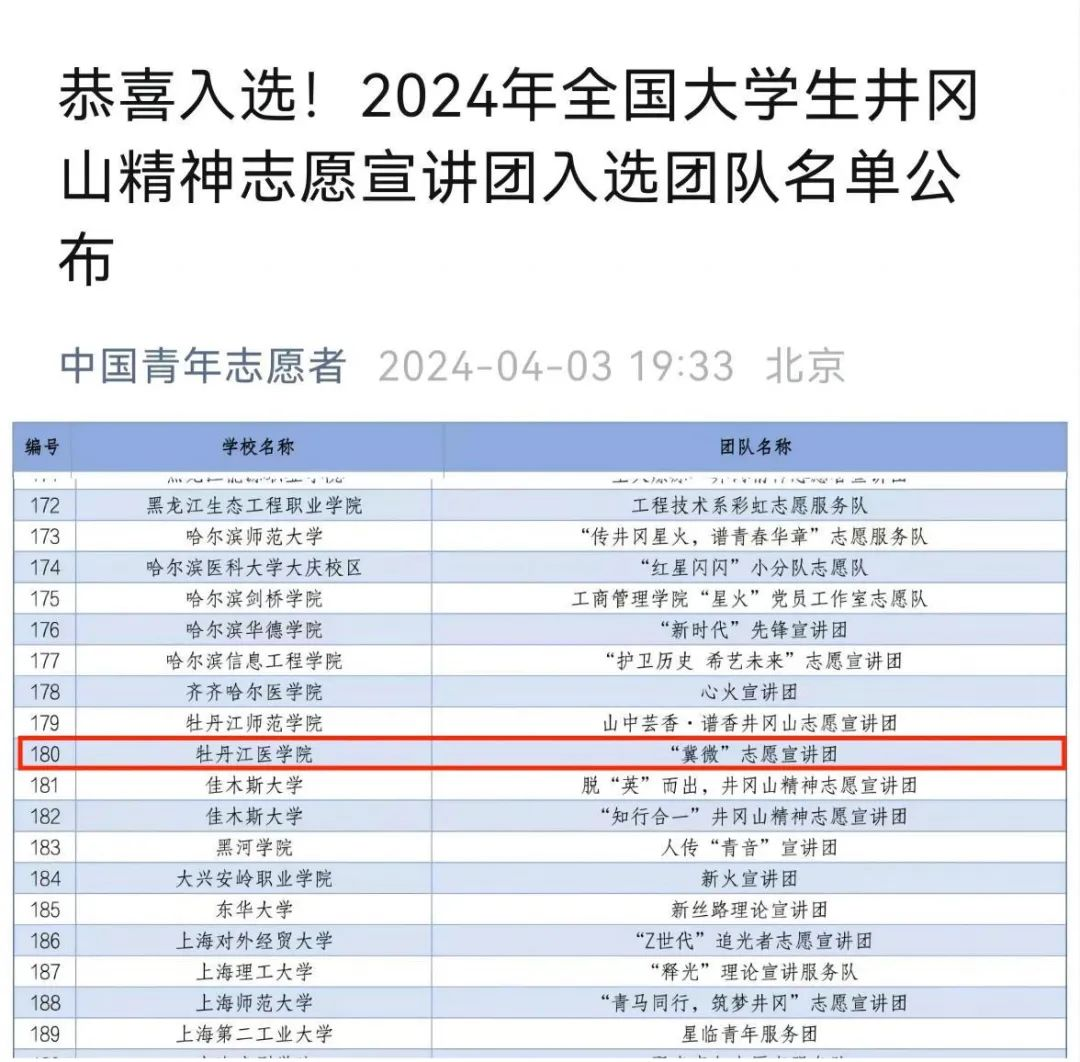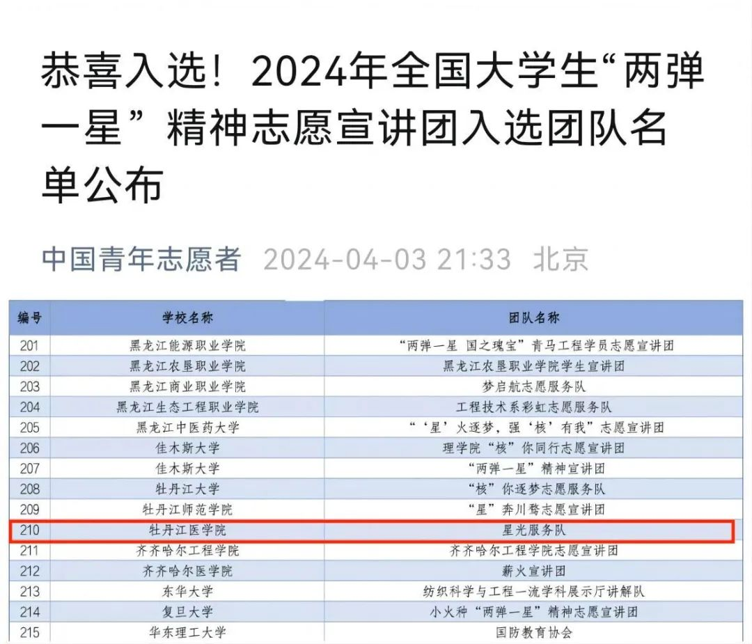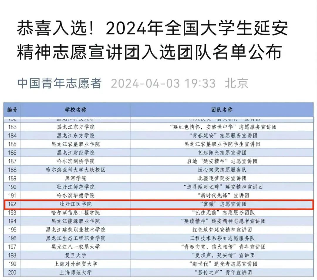 为深入学习宣传贯彻习近平新时代中国特色社会主义思想和党的二十大精神,落实“强国复兴有我”群众性主题宣传教育活动相关要求,引导动员青年学生大力弘扬中国共产党人精神谱系,团中央青年志愿者行动指导中心联合有关单位,开展弘扬中国共产党人精神谱系志愿宣讲活动,面向全国高校遴选大学生志愿宣讲团队,牡丹江医学院及时响应,积极申报,两支宣讲团队入选三个宣讲项目。