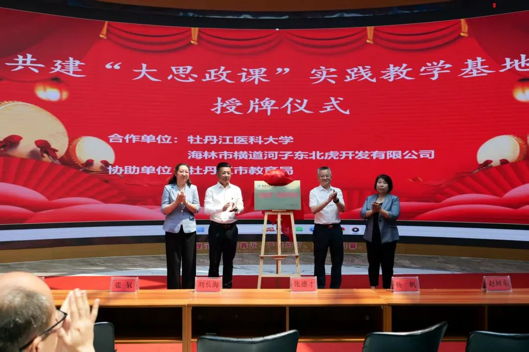 为全面贯彻落实教育部印发的《全面推进“大思政课”建设的工作方案》,落实黑龙江省教育厅相关工作部署,2025年6月18日,牡丹江医科大学与海林市横道河子东北虎开发有限公司共建“大思政课”实践教学基地授牌仪式成功举行。牡丹江医科大学党委副书记张德才、海林市横道河子东北虎开发有限公司经理刘长海、牡丹江市教育局四级调研员张氡、牡丹江医科大学马克思主义学院院长杨帆、牡丹江市教育局思政科科长韩国哲等相关人员参加本次授牌仪式。