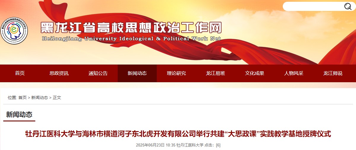 此次学校与海林市横道河子东北虎有限公司共建“大思政课”实践教学基地,是双方积极探索思政教育新模式的有益尝试。未来,双方将不断丰富合作内容,拓展合作领域,共同推动思政课建设内涵式发展。