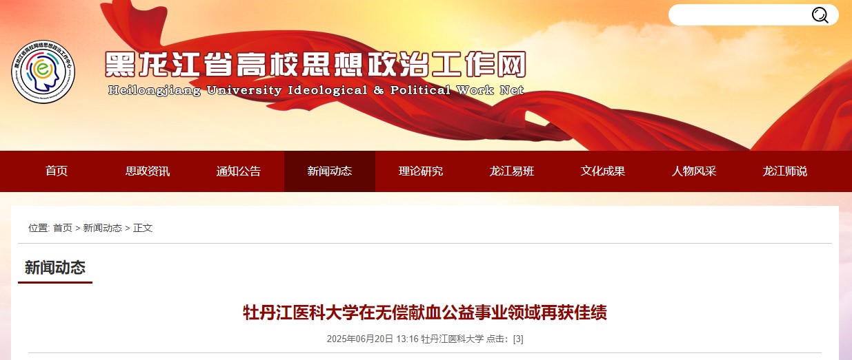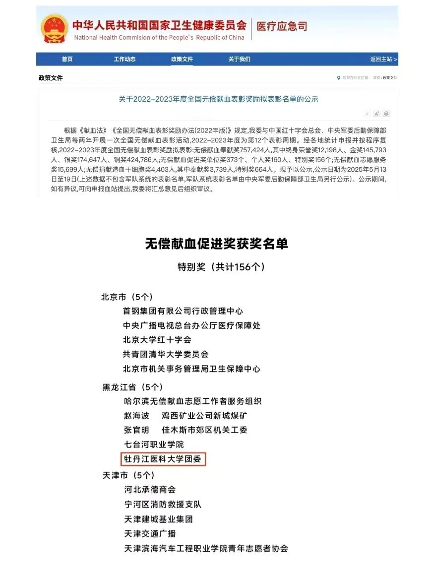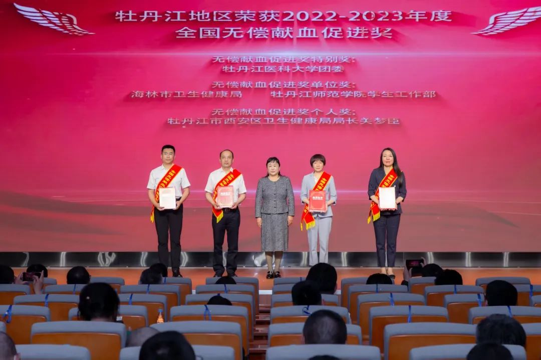6月13日,在第二十二个世界献血者日来临之际,牡丹江市无偿献血表彰大会在牡丹江师范学院教师教育实训楼报告厅隆重举行,我校在无偿献血公益事业领域再获佳绩。其中,学校荣获2022—2023年度牡丹江市无偿献血特殊贡献奖,校团委荣获2022—2023年度全国无偿献血促进奖特别奖,这是继我校在无偿献血领域多次获得表彰后,取得的又一重要奖项!该奖项由国家卫生健康委员会、中国红十字会总会、中央军委后勤保障部卫生局联合授予,每两年评选一次,是国家对无偿献血工作作出突出贡献单位和个人给予的最高奖项,黑龙江省仅3家单位与2名个人获此殊荣。同时,附属红旗医院与附属第二医院荣获2022—2023年度牡丹江市无偿献血应急先锋奖。