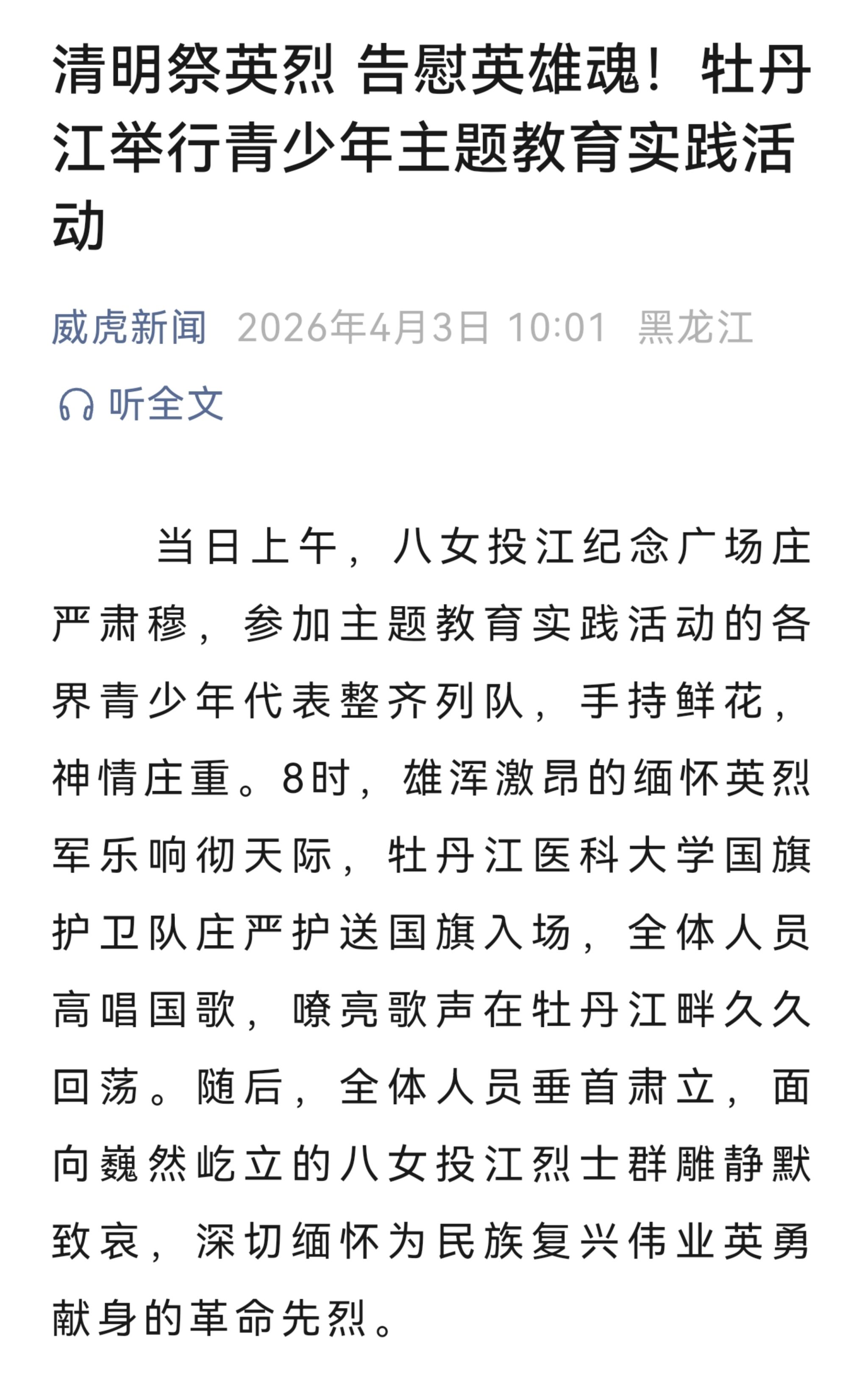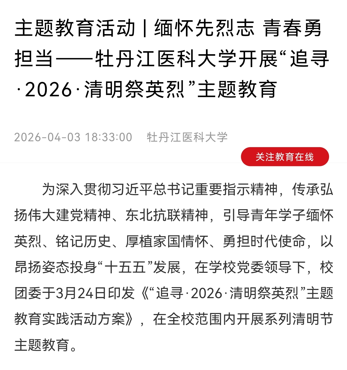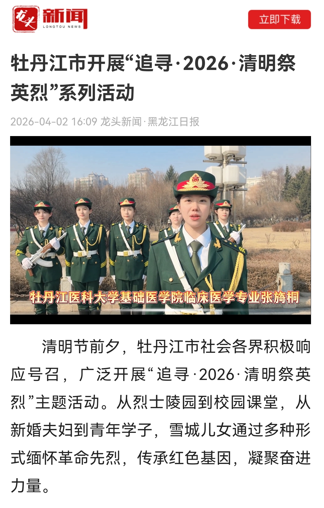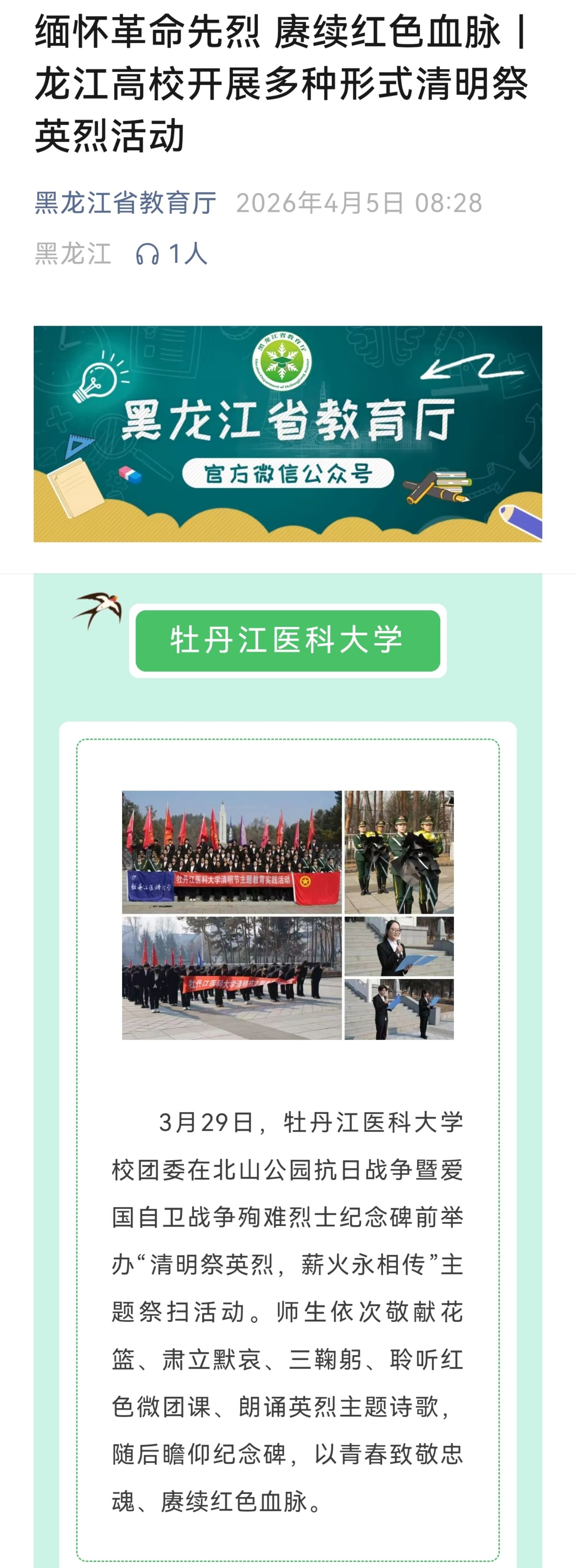 【龙头新闻·黑龙江日报】【黑龙江省教育厅】【中国教育在线】【威虎新闻】缅怀先烈志 青春勇担当——牡丹江医科大学开展“追寻·2026·清明祭英烈”主题教育