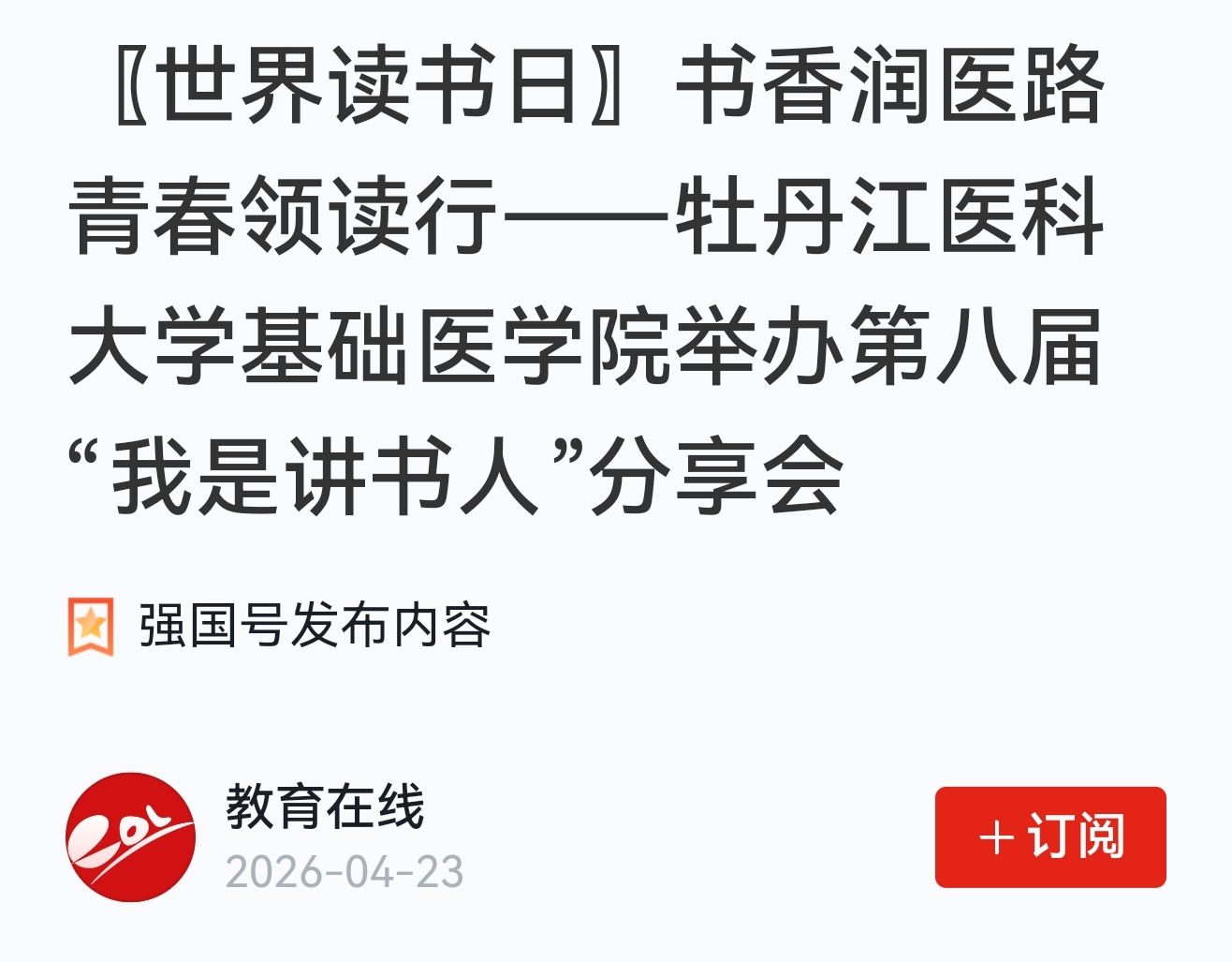 此次“我是讲书人”活动,既是基础医学院书香校园建设的特色品牌实践,也是学院深化树立和践行正确政绩观学习教育、落实立德树人根本任务的重要载体,学院党委把为党育人、为国育才的教育使命当做最大的政绩,未来,学院将把深入推进书香校园建设与医德医风教育深度融合,以文化人、以文育人,引导师生为民造福、实干担当,着力培养兼具医学专业素养与人文情怀、胸怀家国与大医精诚的新时代医学人才,为牡丹江医科大学高质量发展与医疗卫生事业进步贡献力量。