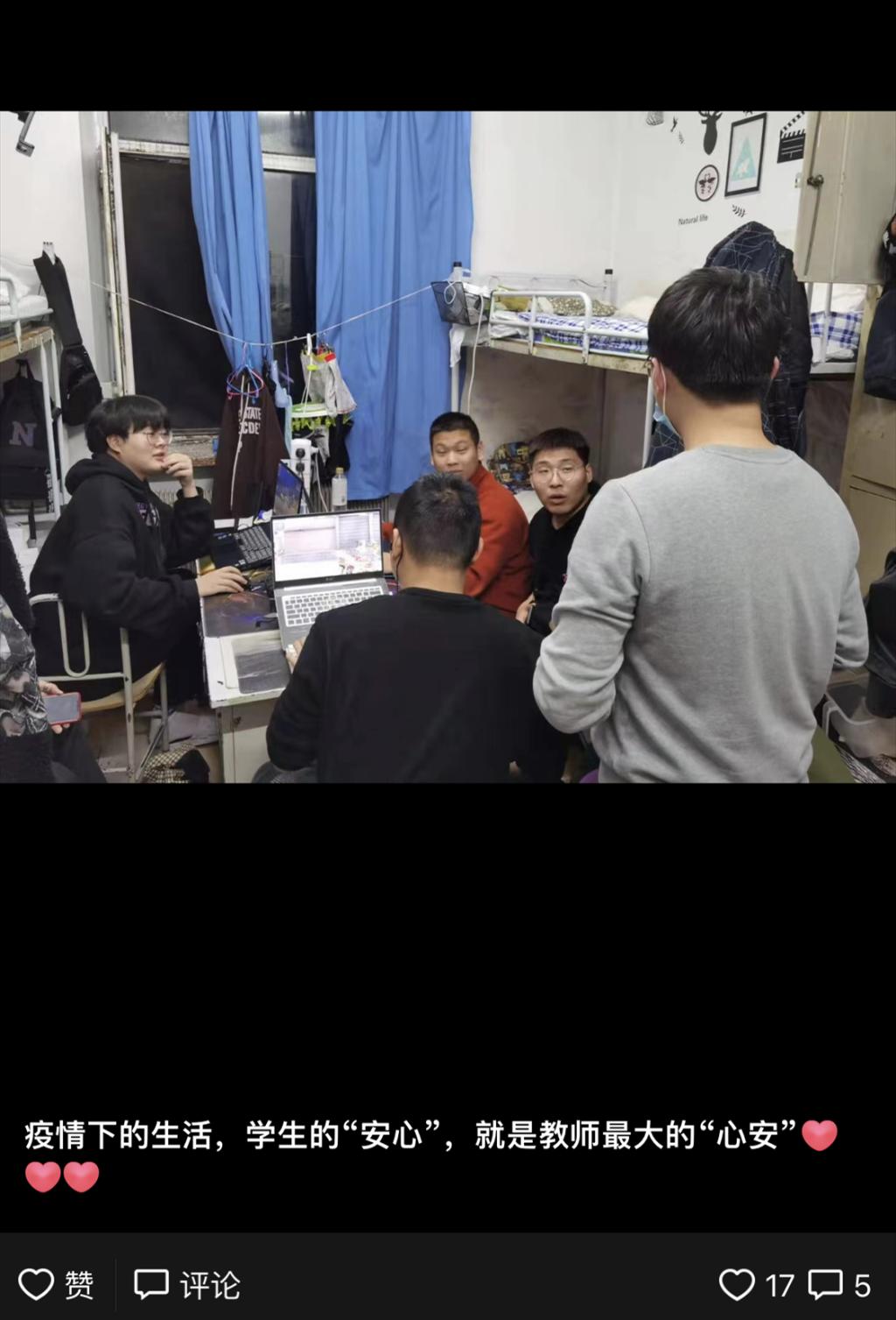 辅导员肖鹏、邱泽航夫妻,辅导员刘磊、孟晨夫妻都同时选择进入封闭管理的校园和学生同吃同住,共度时艰;辅导员赵春阳在封校期间度过了难忘的40岁生日;辅导员张春丽、唐懿鸣、王孝锦、石杰、宋宇亮、邓菲等老师,她们把孩子交给老人或者朋友看管,选择与学生们一起;辅导员宋海南、仲昭奇、付小达、王星“轻伤不下火线”,带病坚持上岗……在牡丹江医学院,这样的例子数不胜数。