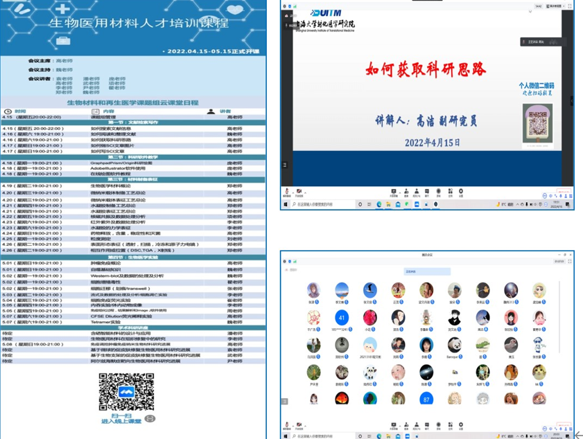为确保在学校封闭静态管理期间研究生培训教育和学习两不误,学院与上海长海医院的专家通过密切的科研合作,创新教改。多位师生历经半月之余的精心准备,生物材料人才培训系列课程在4月15日正式上线。该系列课程涵盖了文献阅读写作、科研软件教学、材料制备表征、生物医学实验与学科前沿讲座等生物材料和再生医学领域完整的知识体系,为学院的师生提供了一个学习和科研氛围,让大家足不出户就能了解相关资讯,开拓了科研思路。