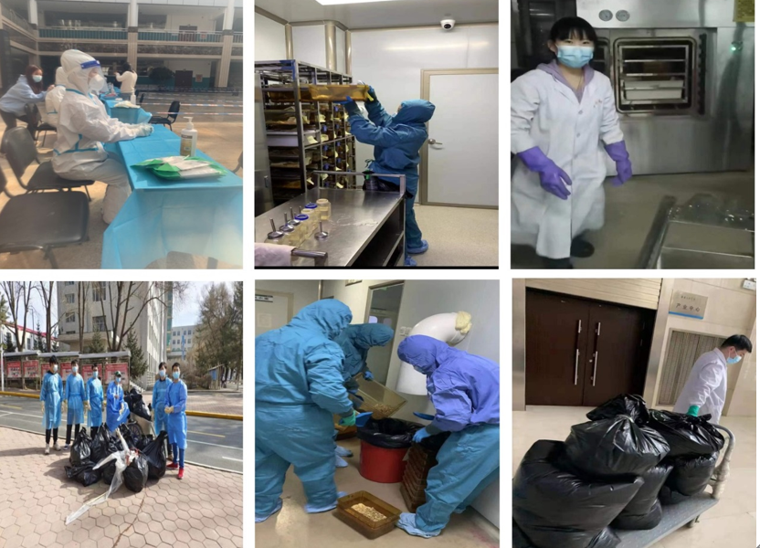 由于牡丹江市突发新冠肺炎疫情,学校迅速按下疫情应急处置响铃,全校静态管理,科研处全体同志及实验动物饲养工人均不能到校工作,几千只教学及科研用鼠的饲养、平台的环境消杀成为亟需解决的问题。经过认真研判,科研处紧急启动科研共享平台安全管理预案。我院即刻响应,广泛发动本院研究生投身疫情应急处置志愿工作。其中张雪娇、苏然宇、朱彦兆、张劲、张蒙等5名研究生主动请缨,通过流调排查后成立临时工作小组,在平台管理人员远程指导下,承担起对科研共享平台环境消杀、SPF动物饲养及部分动物实验等工作。由于人少,工作量大,每次工作结束,他们都汗流浃背,精疲力竭,可他们的脸上却露出了胜利的喜悦。学院其余在校研究生也积极响应学校的号召,迅速集结,参与清扫校园、核酸检测等工作。他们说“想到能够为牡医尽一份力量,我们的付出就十分值得”。他们无私奉献、勇于担当的行动,是对牡医精神的最好诠释!